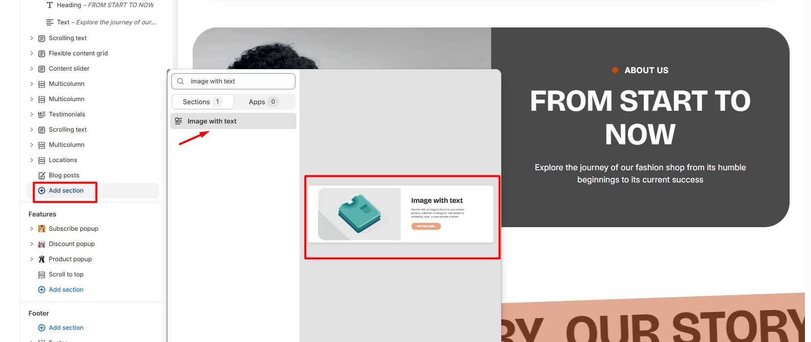From any page, click on “Add Section” and choose “Image with text” from the list.