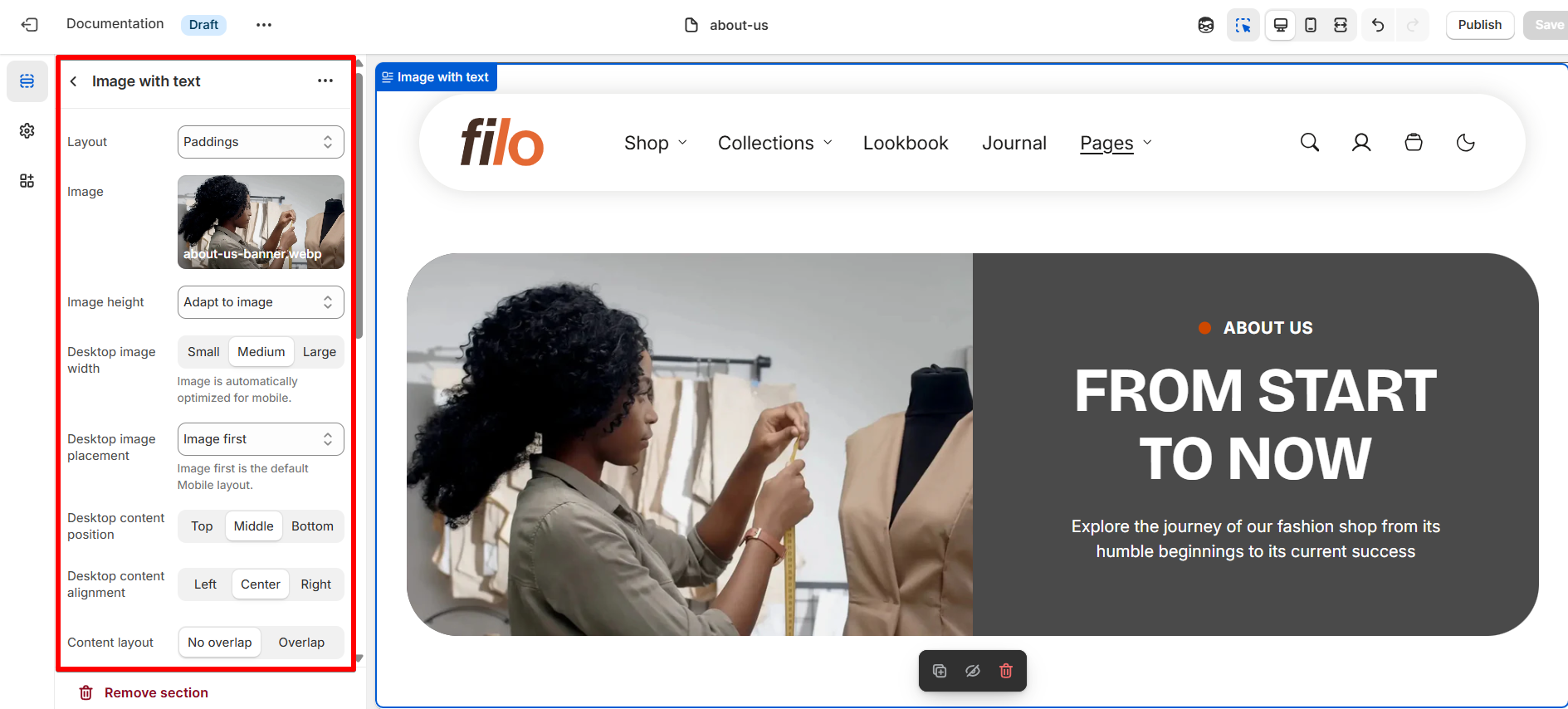 The Image with text section offers a flexible way to create visually appealing layouts that blend imagery with informative content. It's designed to help you present your brand, or services, in a compelling and interactive format.