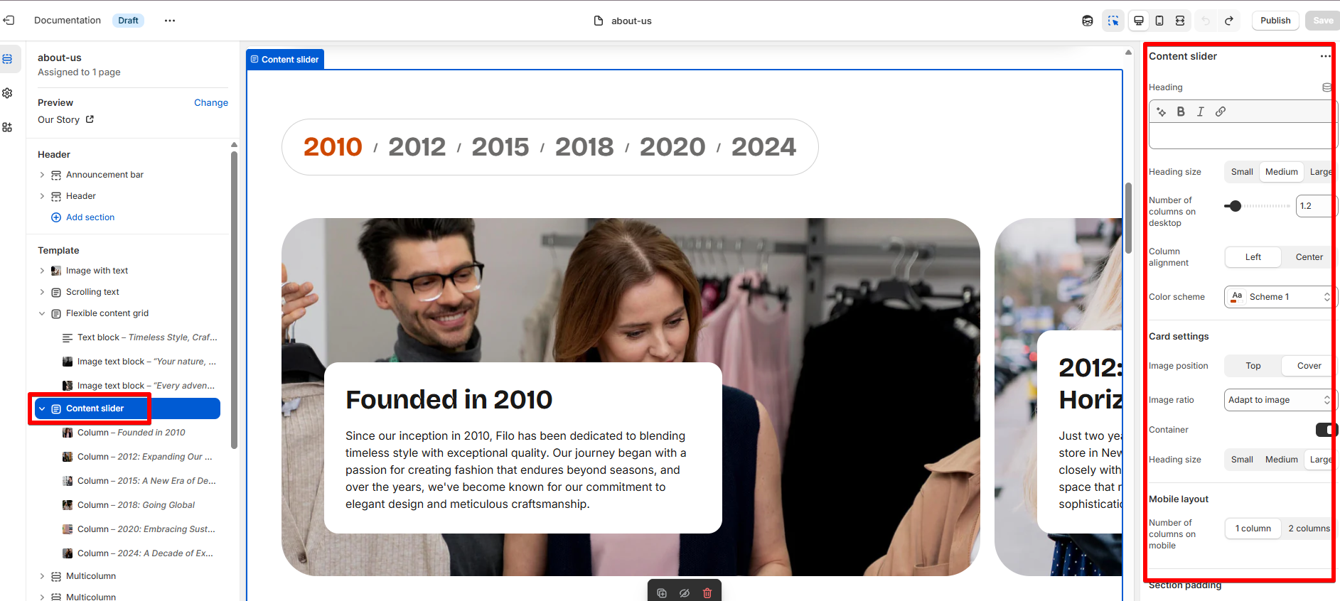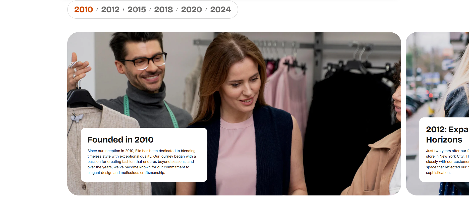 This guide describes the Content slider section. Use this section to display multiple slides with images, text, or other content in a carousel format. The main idea is to tell the story of your company, brand, or key events in chronological order. By clicking on a tab with a specific date, users can navigate directly to that event.