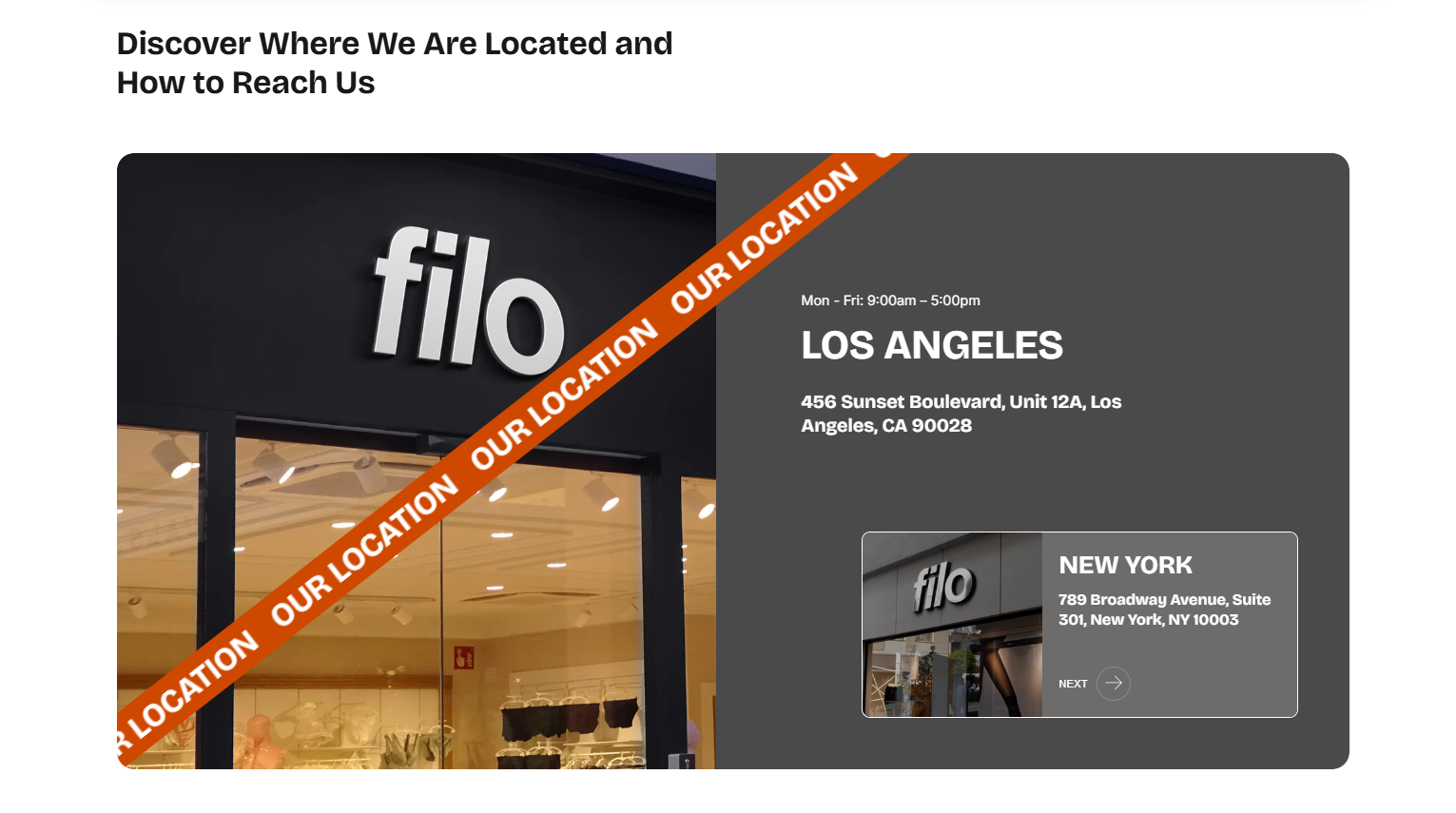 The Preview slider section is displayed on the Contact Us page, featuring location images, working hours, and physical addresses.