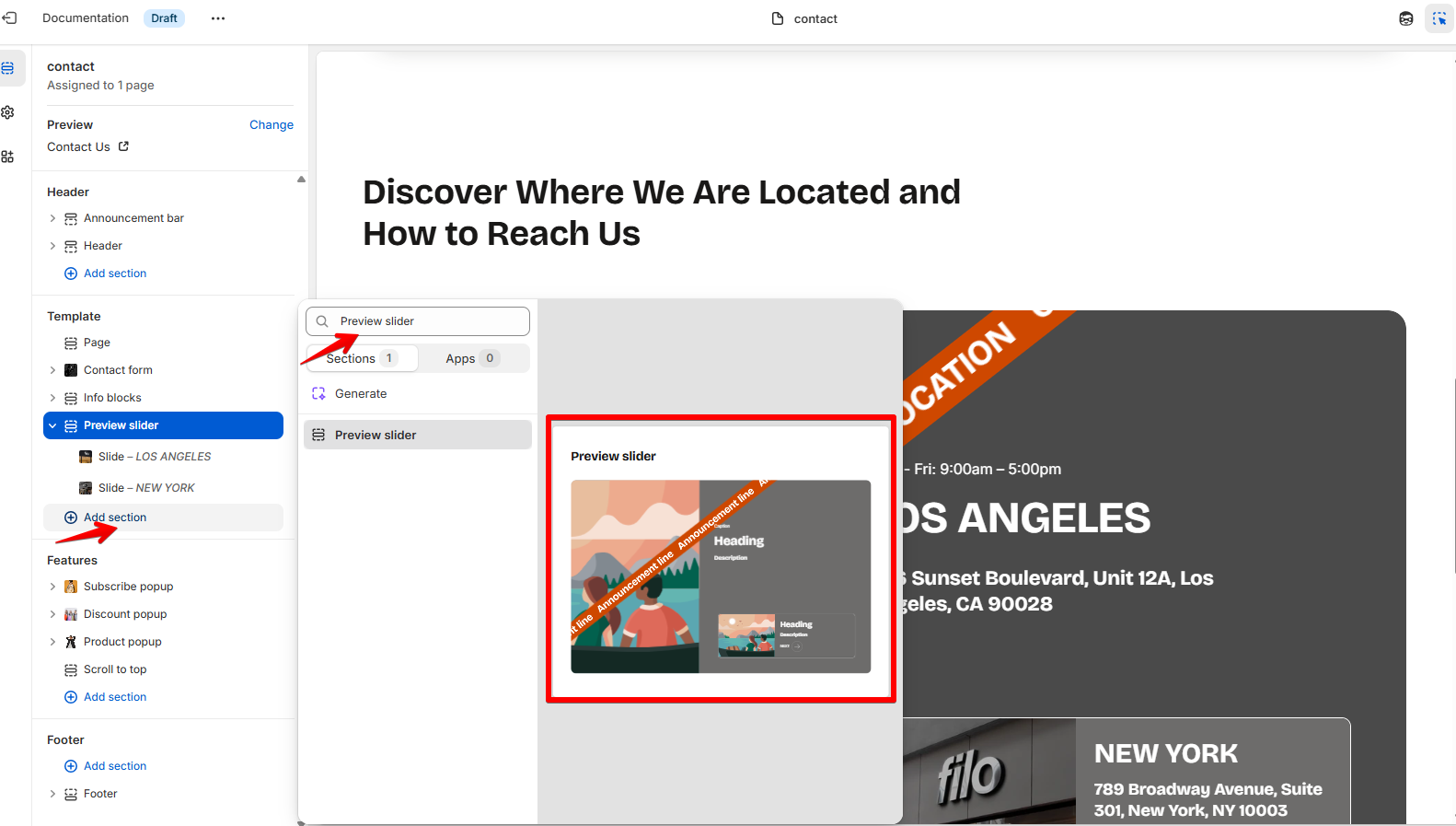 This guide describes the Preview slider section. Use this section to display multiple slides with images, text, allowing users to navigate through content quickly and interactively.