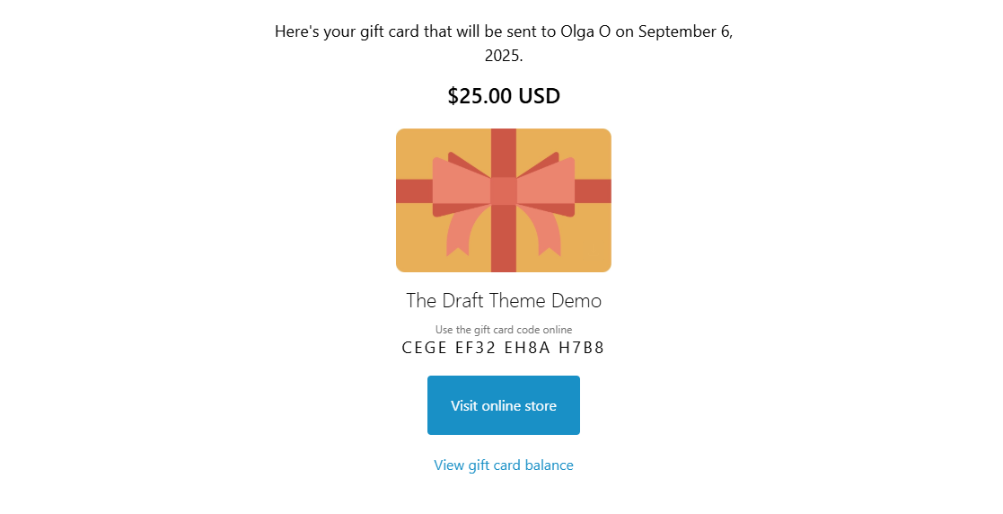 - The recipient receives an email that contains the gift card in the selected denomination.