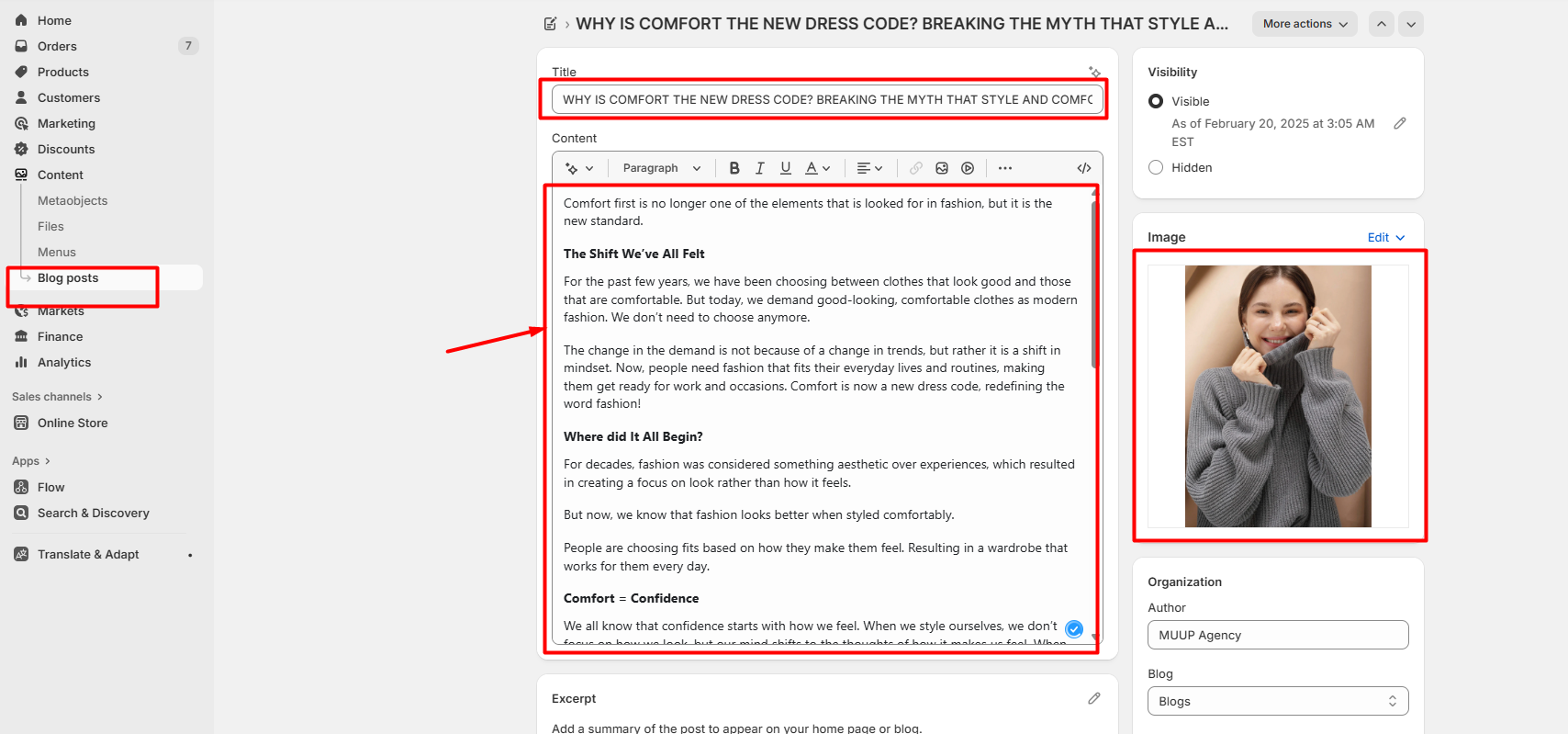 | Color scheme | Select a color scheme from the available list to style the blog post template, including breadcrumbs, featured image, content area, and comments form. Each scheme controls background, headings, text, and other elements for a consistent look. Note: Blog post content is managed from your Shopify admin under Dashboard → Blog posts → Add blog post → Content. |