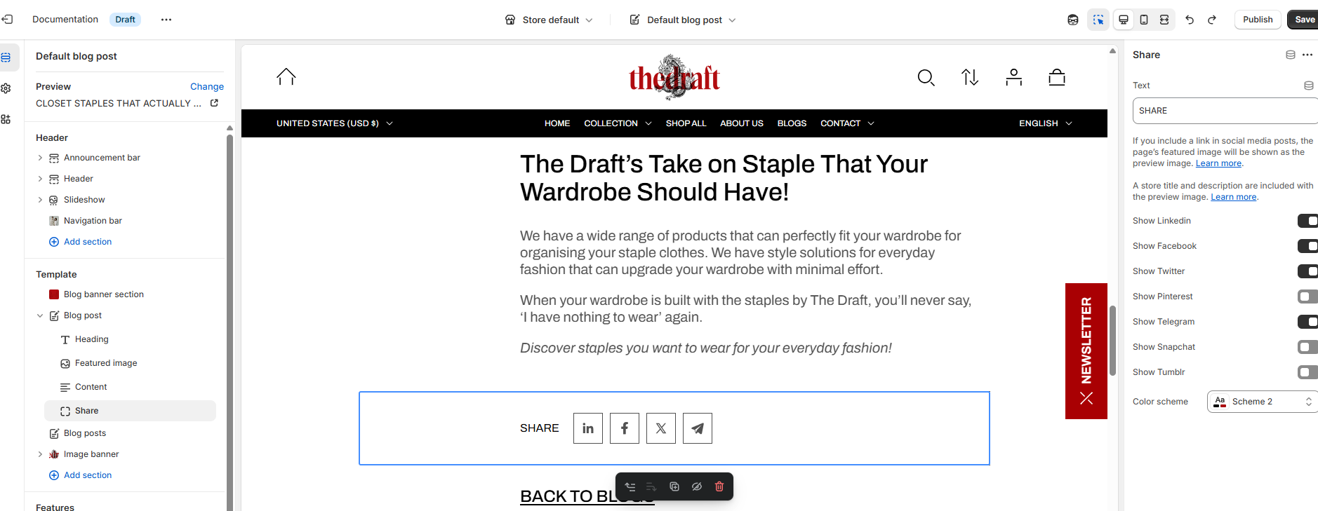 Shows or hides “Telegram” icon. The icon leads to Telegram and you can share the specific blog post on your profile. |
