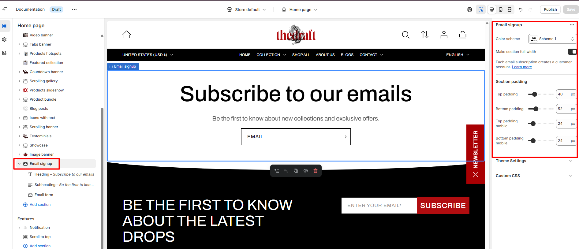 The Email Signup section allows you to capture customer email addresses and grow your mailing list. It’s ideal for keeping your audience informed about new products, promotions, and updates.