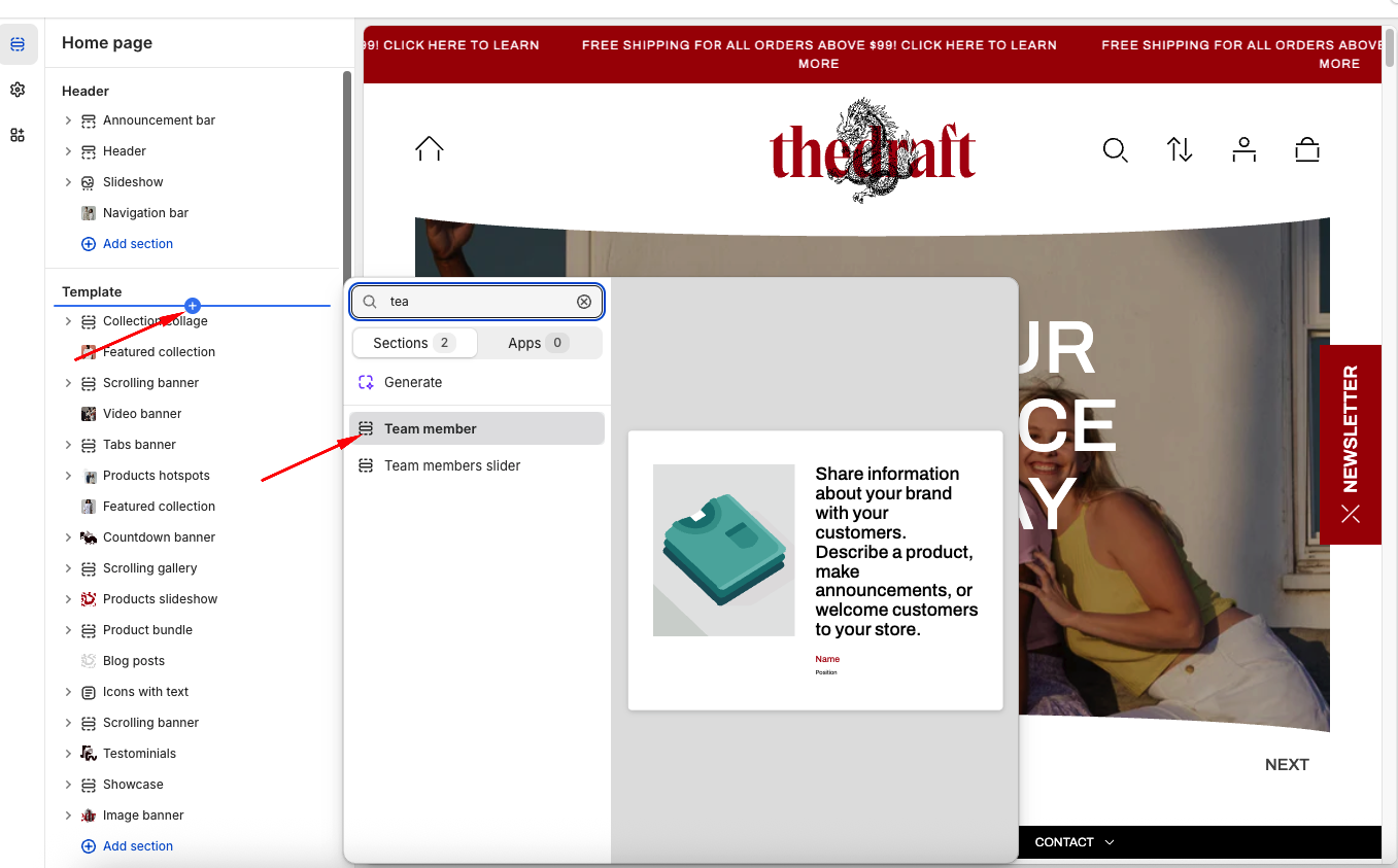 - On any theme template, click “Add section”