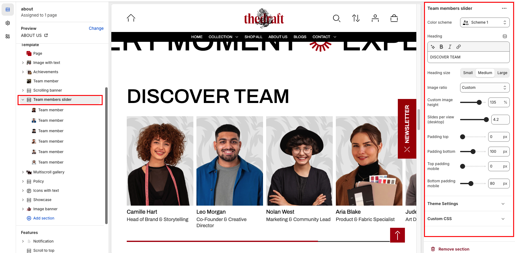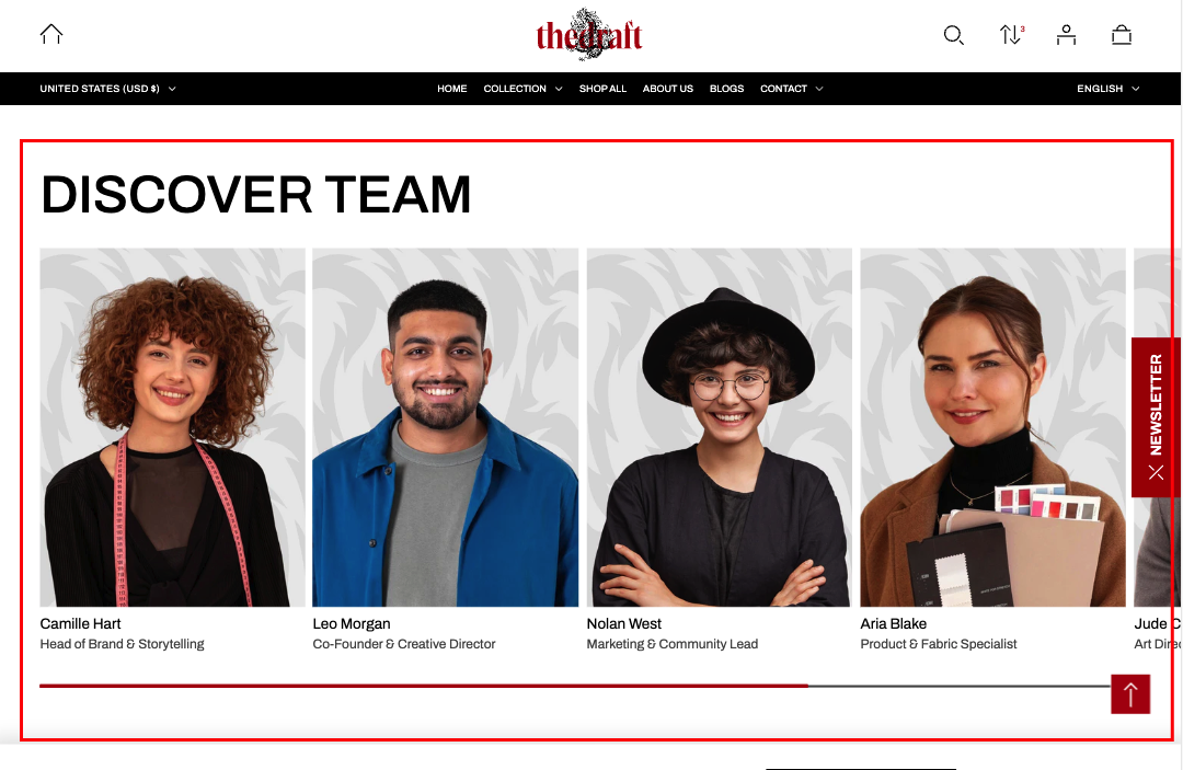 | Slides per view (desktop) | Controls the number of team members' cards visible in this section per view. Adjust the value using the slider. *Note: On mobile devices, the section maintains a stable layout, consistently showing one full card and a portion of the second card. |
