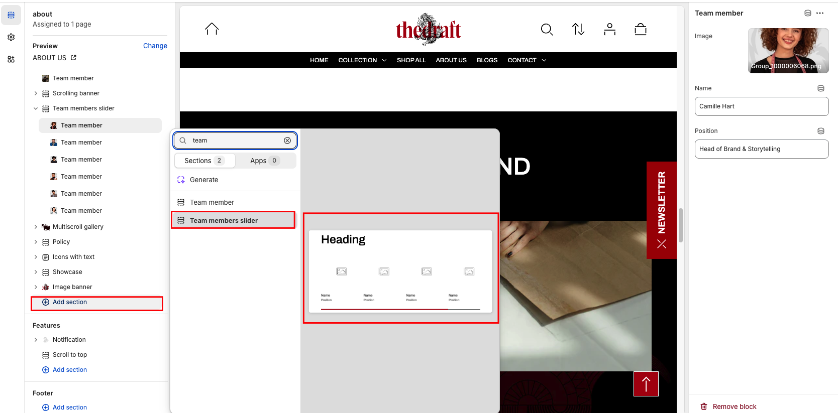 From any page, click on “Add Section” and choose “Team members” from the list.