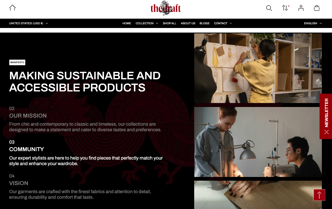 Multiscroll Gallery – this section contains blocks that include both an image and a text element. Images are displayed on the right side as a vertical slider, while the corresponding text appears on the left. As users scroll through the images, the text scrolls in sync and its color changes to clearly indicate which block the user is currently viewing.