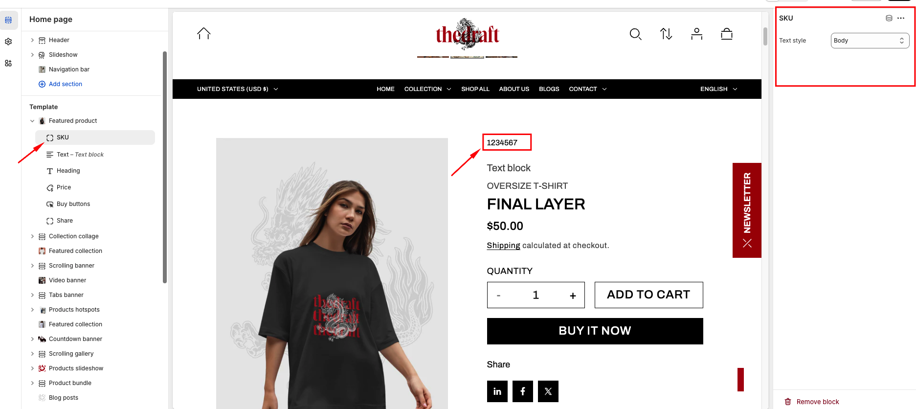 - Integrate a “SKU” block into this section by clicking on “Add to block”.