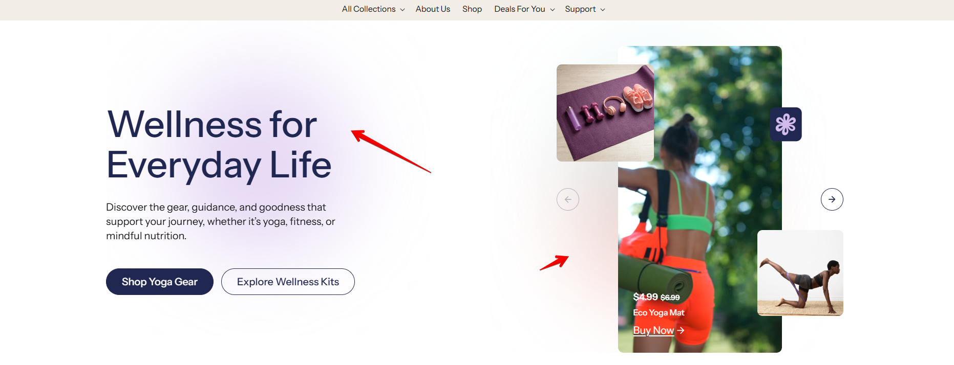 Each product slide can feature an image or video as the main media, along with product information such as title, price, and a button linking to the product page. Additionally, you can add 1–2 overlay images and a decorative icon, with adjustable positions for each slide.