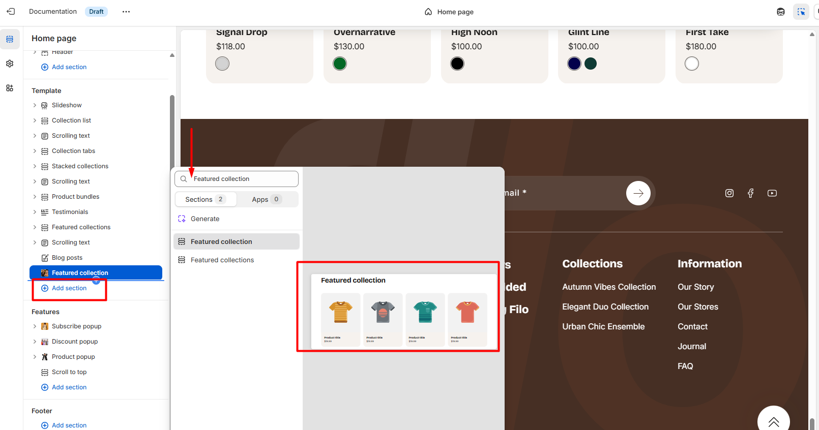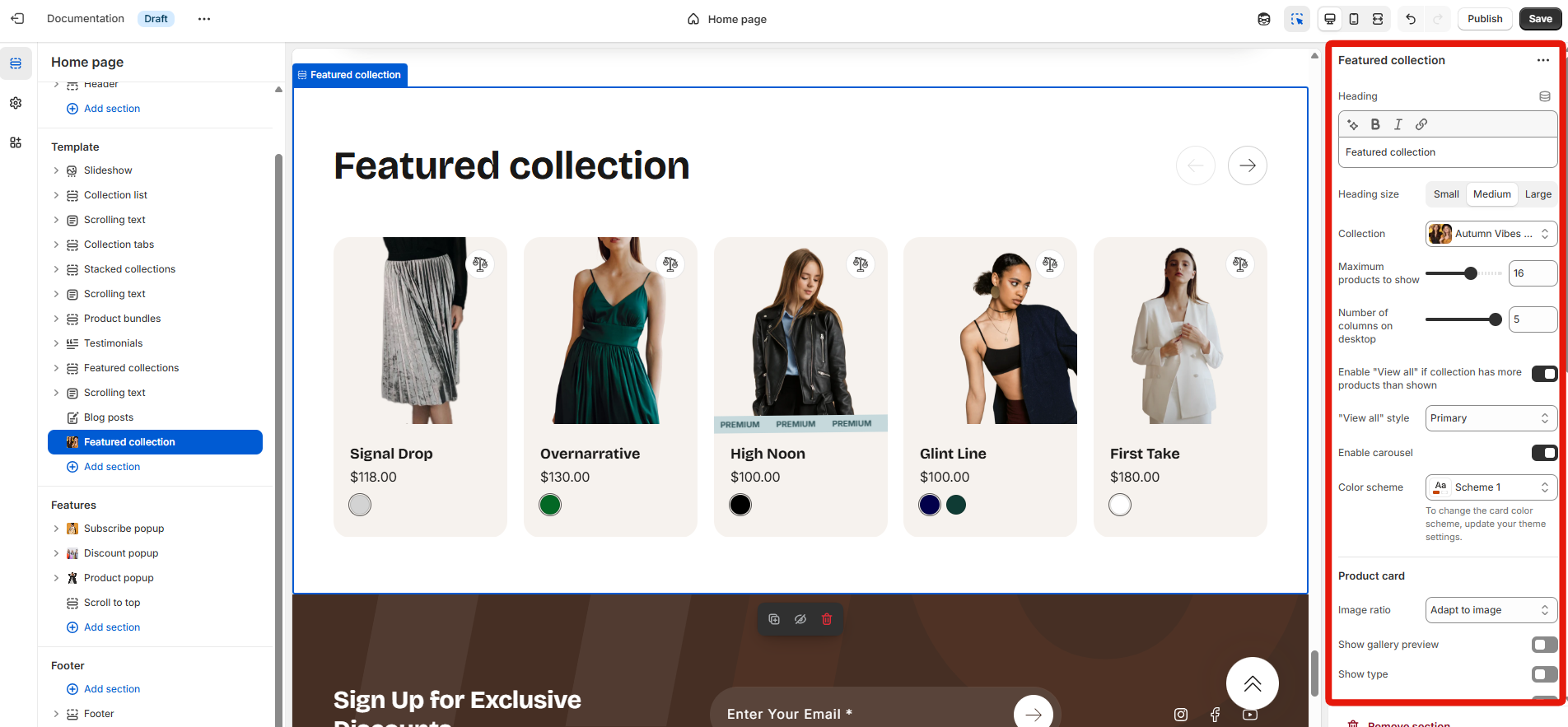 To start customizing your collection, click on the “Featured collection” section to access its settings.