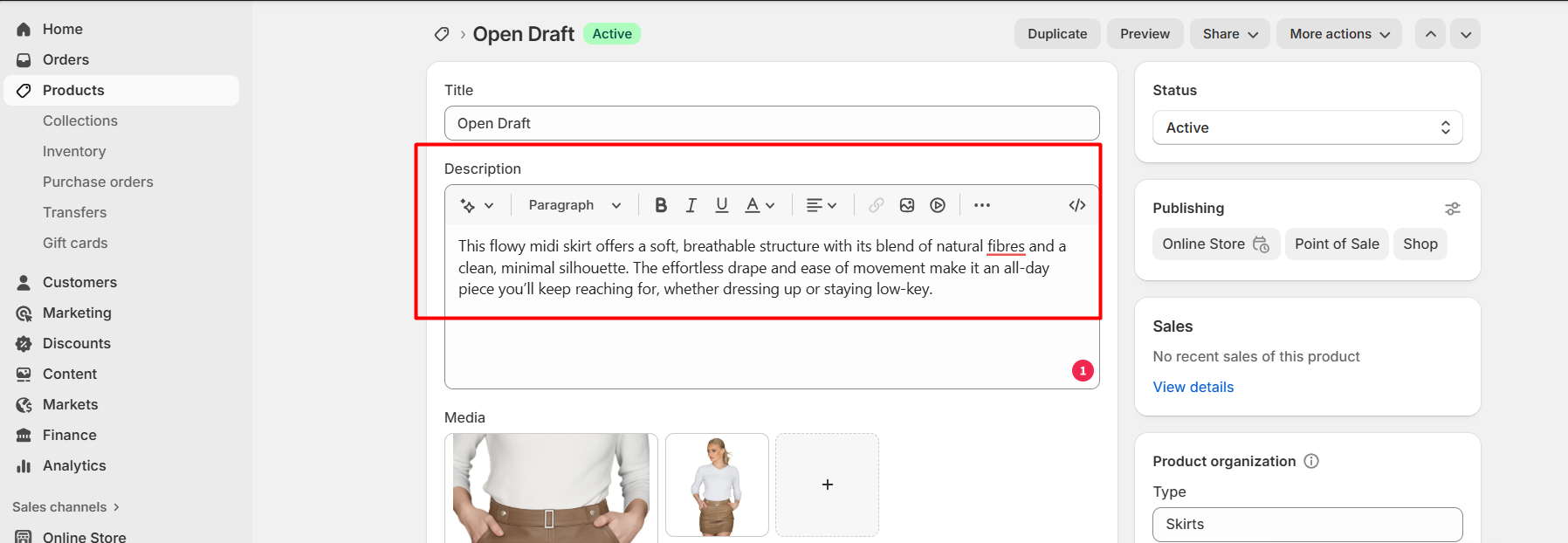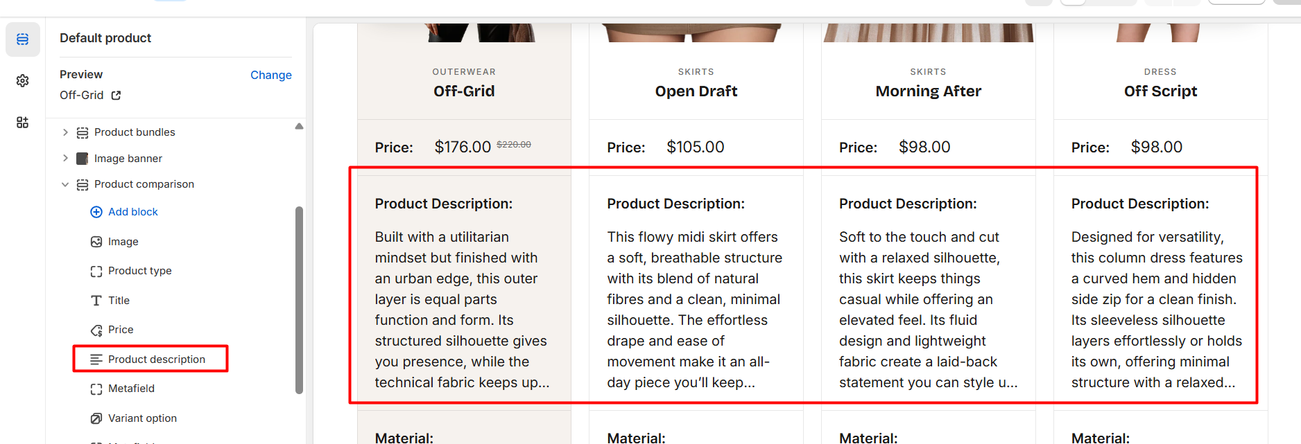 | Row label | Add a label, “Product description” or “Description”, and product description of each product appears automatically if it has been added before on the product detail page. Check on screenshot below.