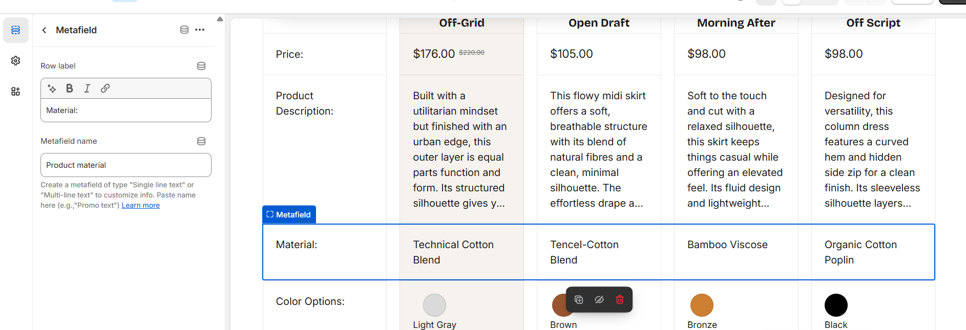 Add a “Metafield” block to display a row in the table. You can add Metafield block a lot of times.