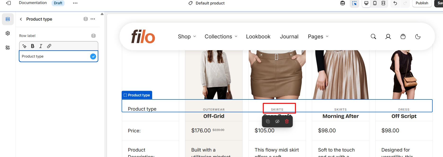 | Row label | You can add a label for the product type. When the Row label position is set to “Aside,” the label will appear horizontally aligned with the product price in the column before it, which provides a cleaner layout. |