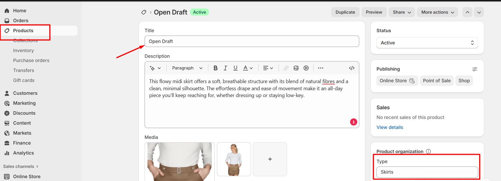 To display the product type in the table next to each product, make sure the product type is added on the product page.