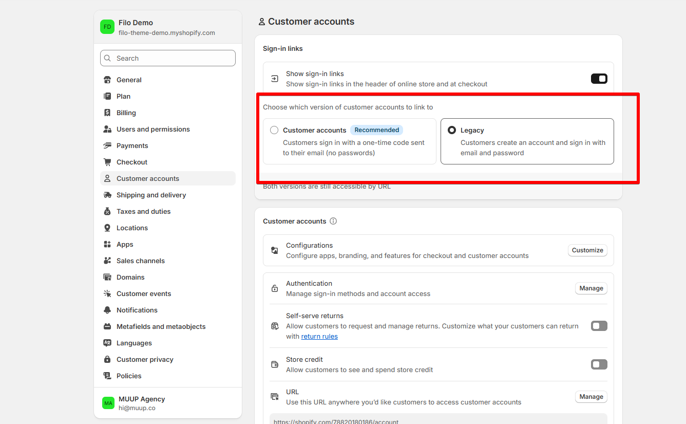 Both customer accounts and legacy customer accounts are available to you and can be used by your customers. You can choose which version of customer accounts to use in your online store. If you decide to use the new version of customer accounts, then most links to legacy customer accounts will automatically redirect to customer accounts. Learn more about upgrading to customer accounts.