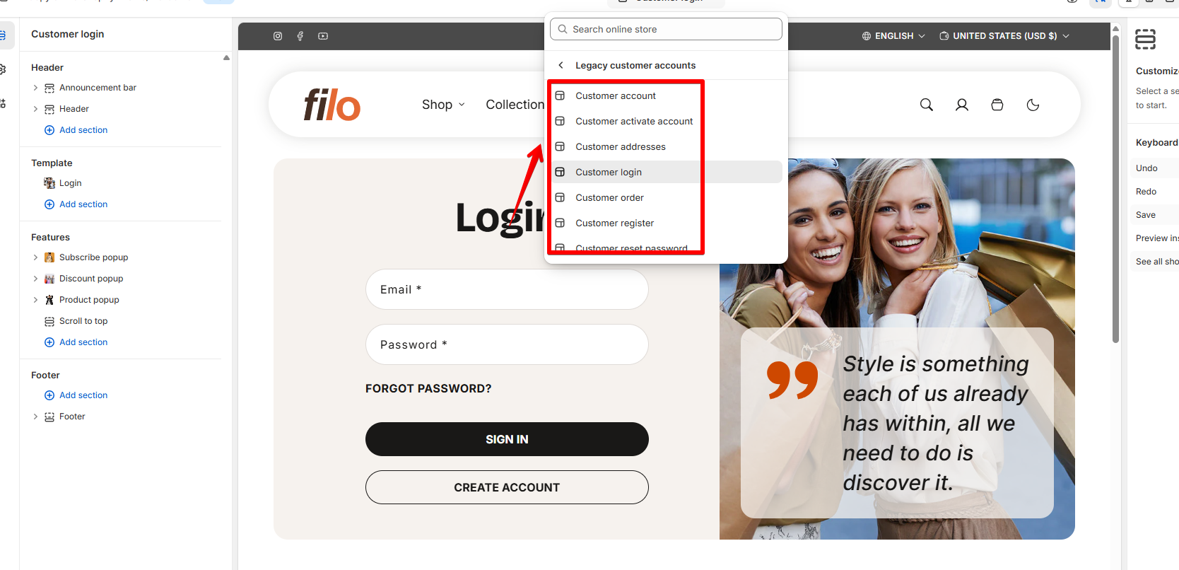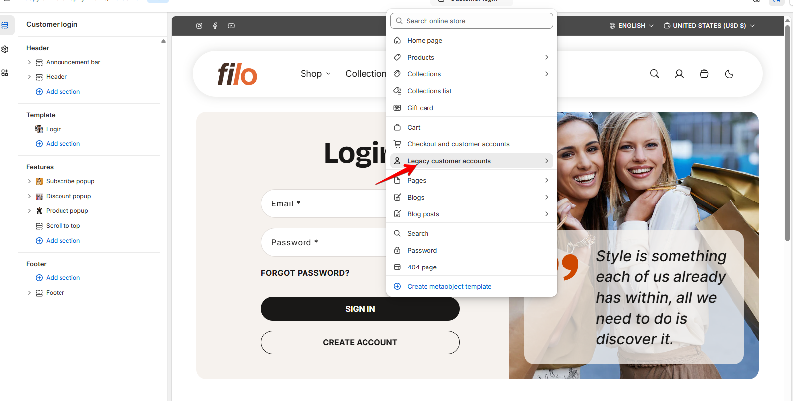- Legacy customer accounts lets your customers log in using an email and a password.