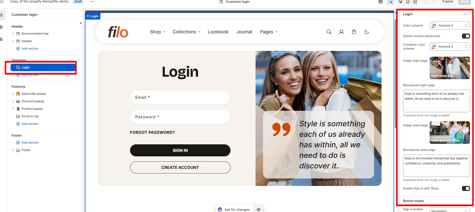For login and reset password page, you will see these settings: