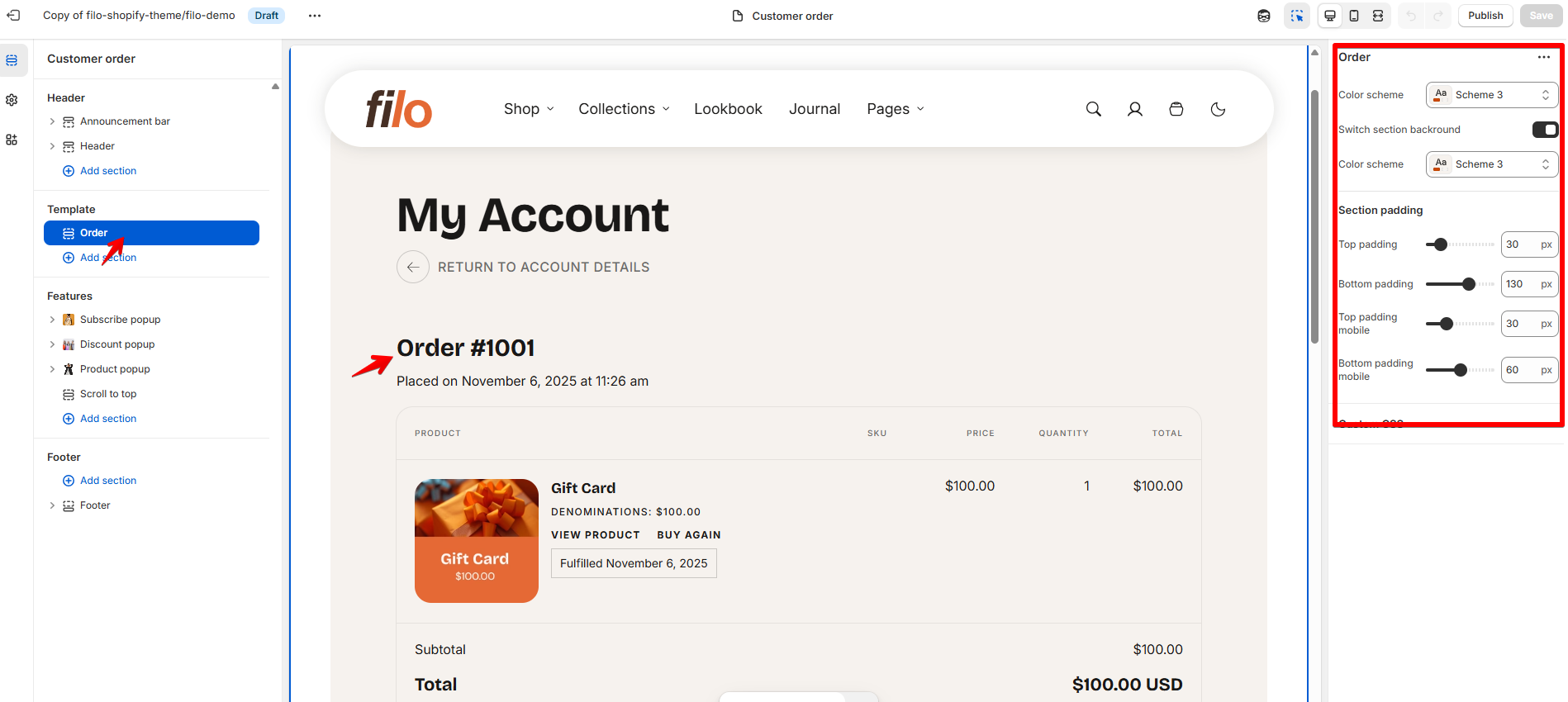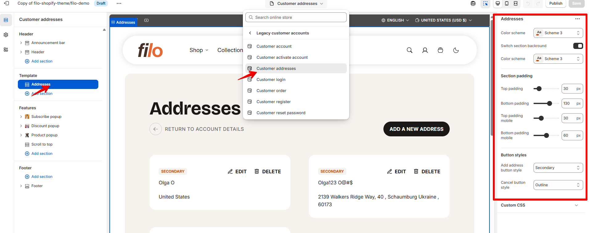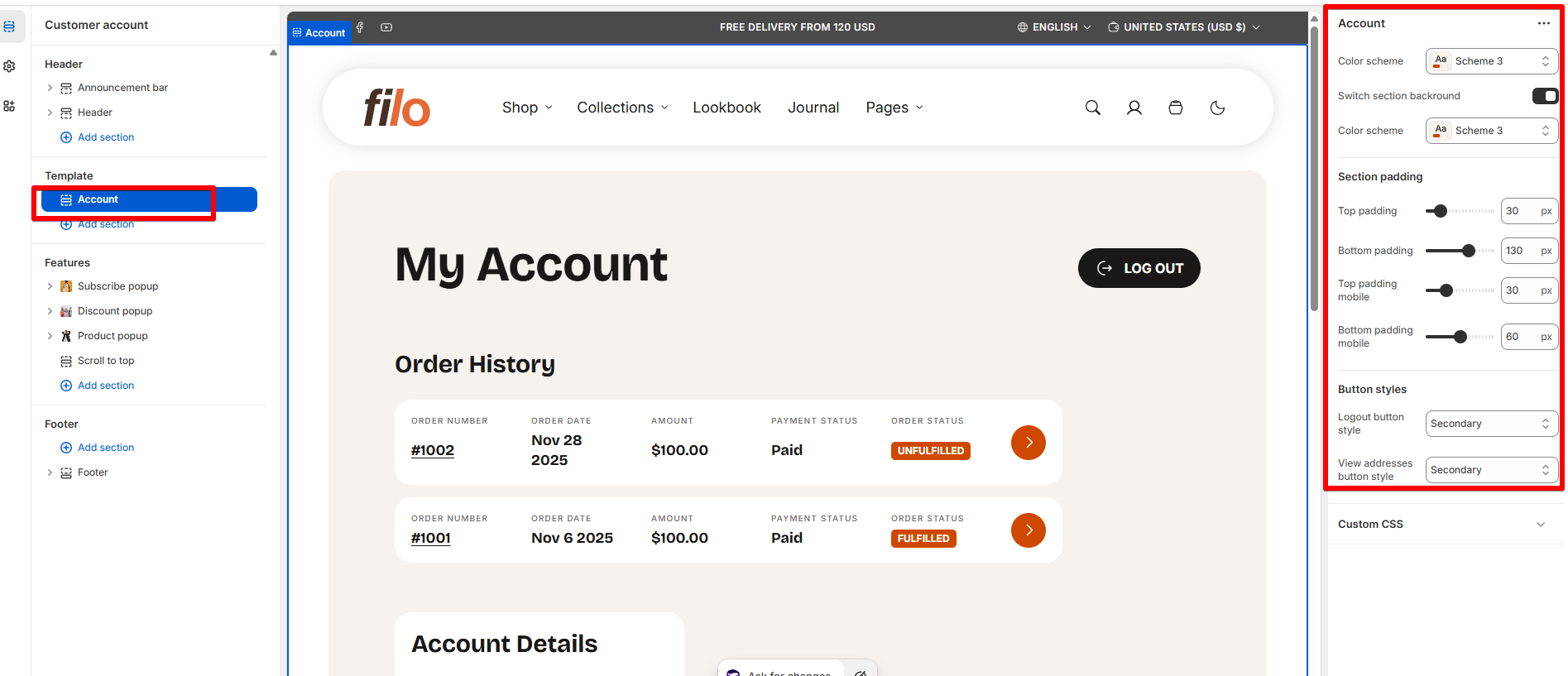 To see settings of order and addresses pages, you need to log in at first to see these pages. After login, click on Customer addresses or Customer Account at the top of the customizer to see settings of these pages.