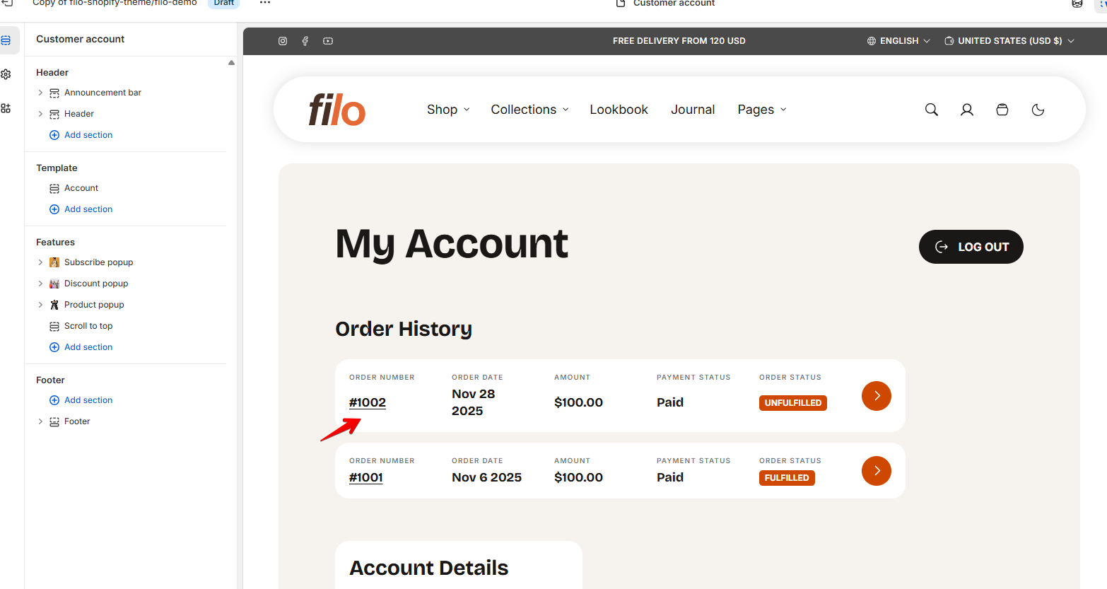 Customer accounts let your customers log in to view their orders, profile information, and saved addresses. When a customer logs in, the details stored in their account are autofilled during checkout for a faster checkout experience.