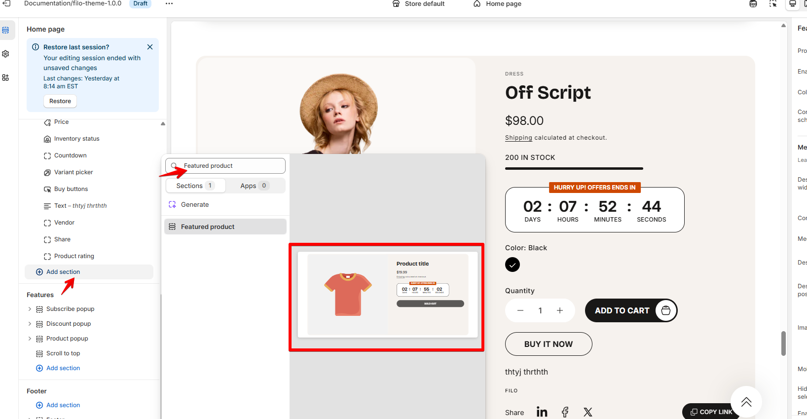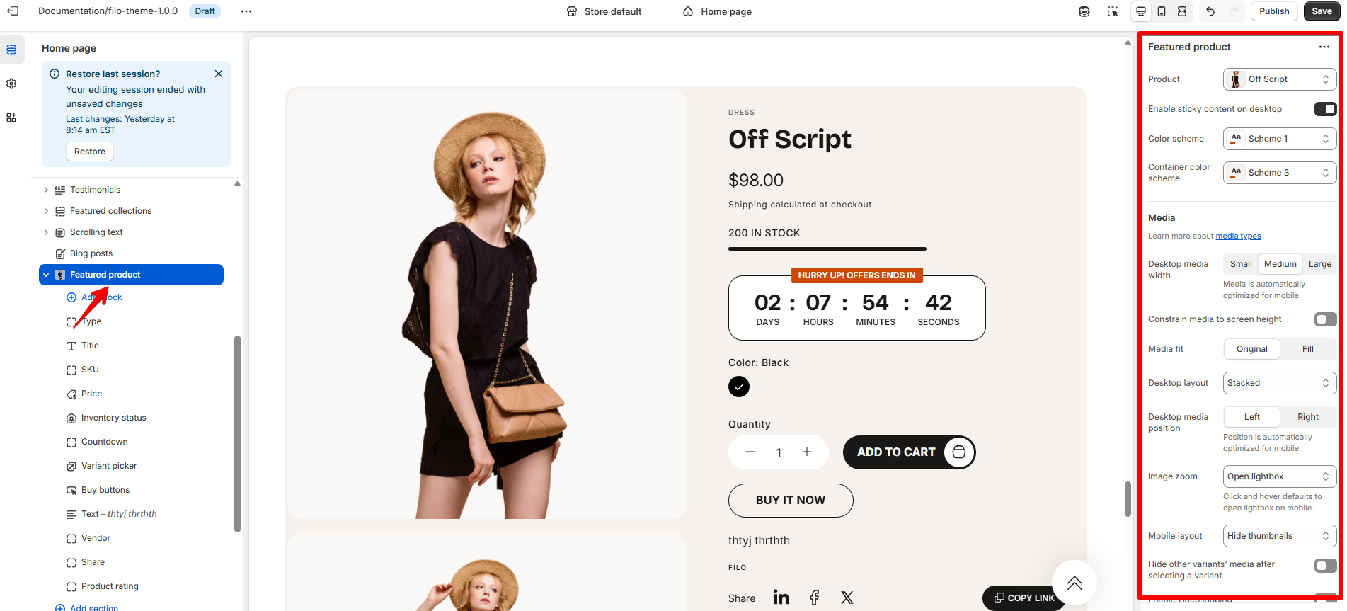 After adding the Featured Product section, customize its appearance and functionality using the available settings.