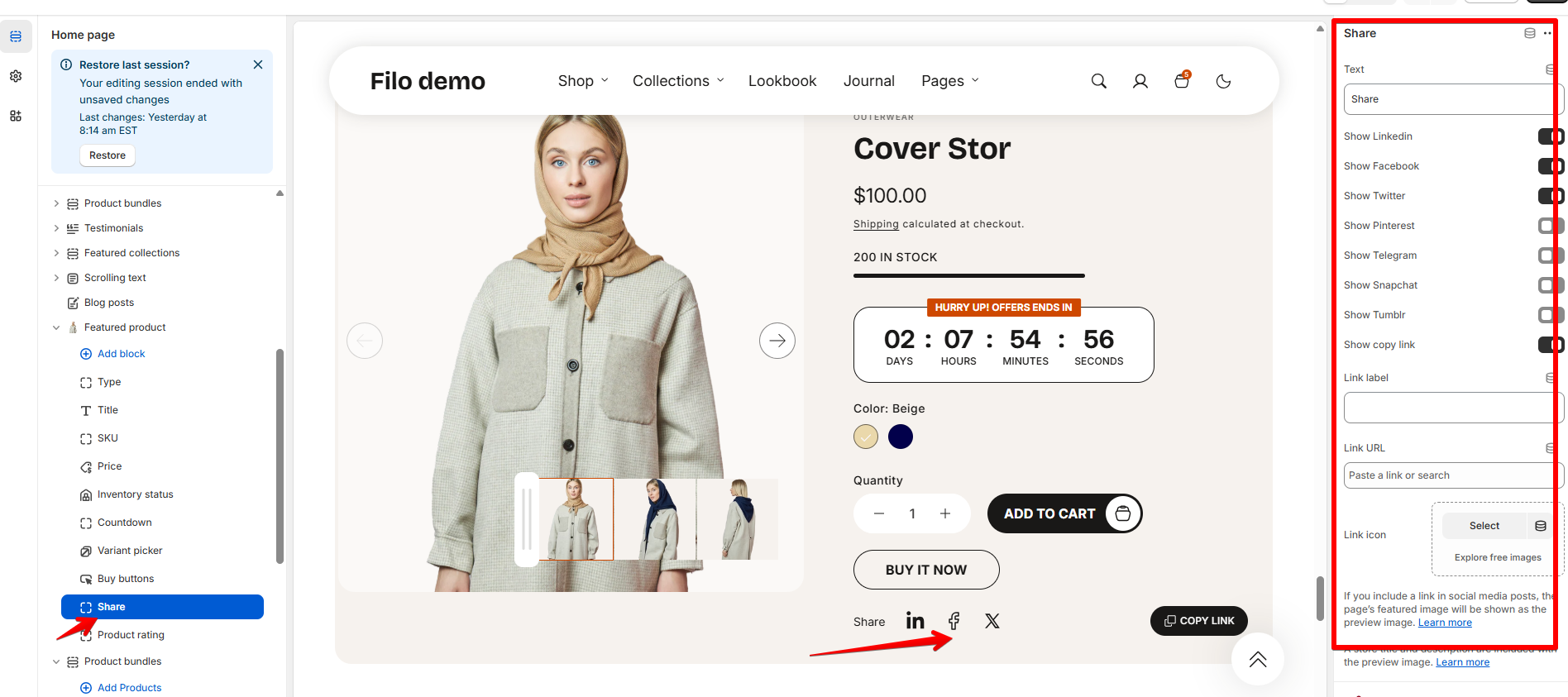 Share block can be added through “Add block” in “Featured Product” section. You can move this block where it fits the best in this section.