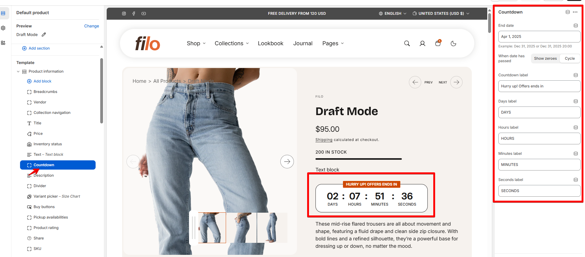 End date Please refer to the example provided below the field to ensure you correctly input the end date for a discount period. Verify that the end date in the featured product section's countdown bar block matches the one on the product detail page.