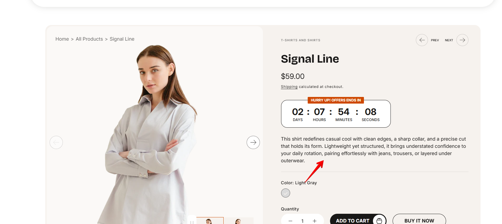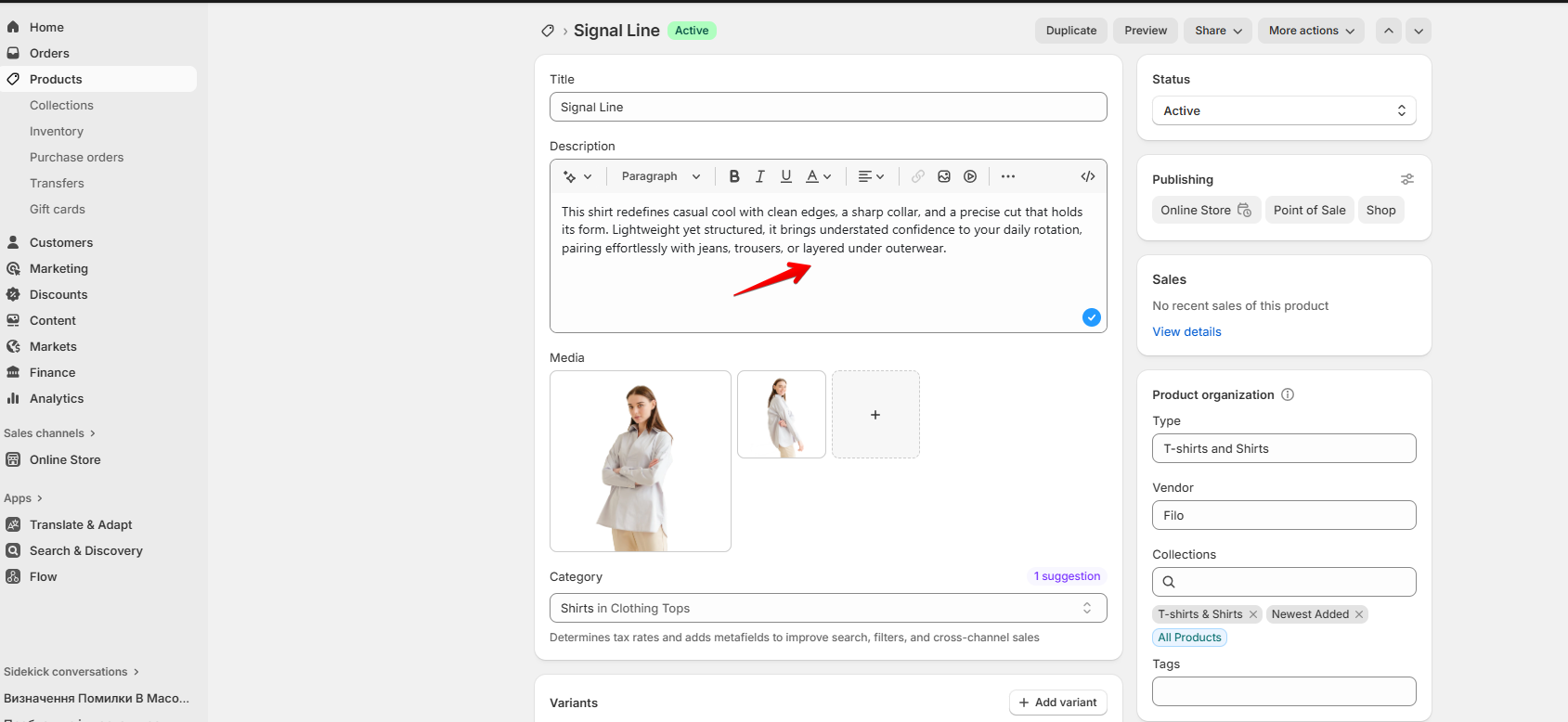 Description comes from the product detail page of Admin panel. If you enter text there and add the Description block in the theme customizer, this text will appear on the site’s page.