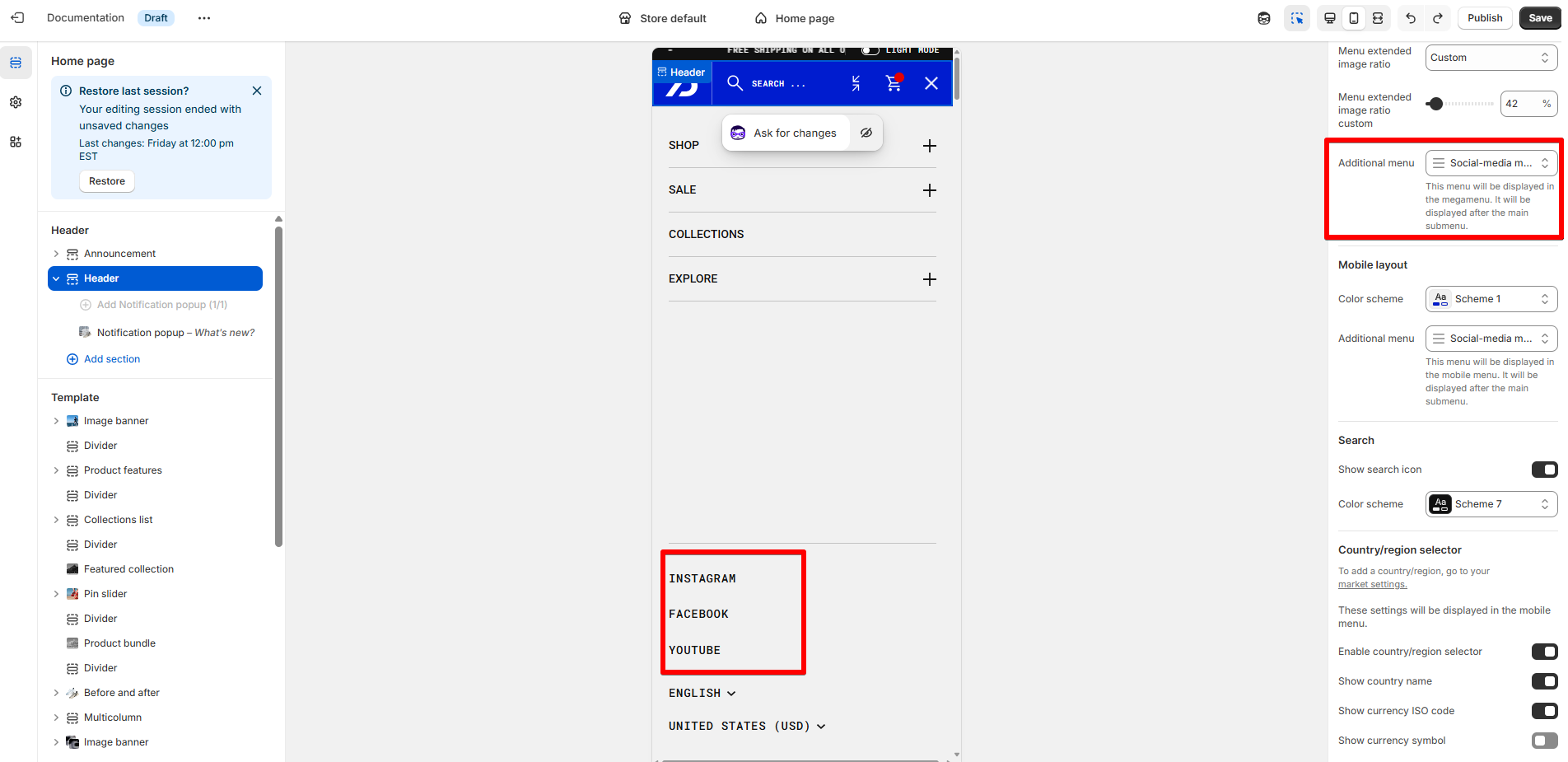 | Enable country/region selector (To add a country/region, go to your market settings) |