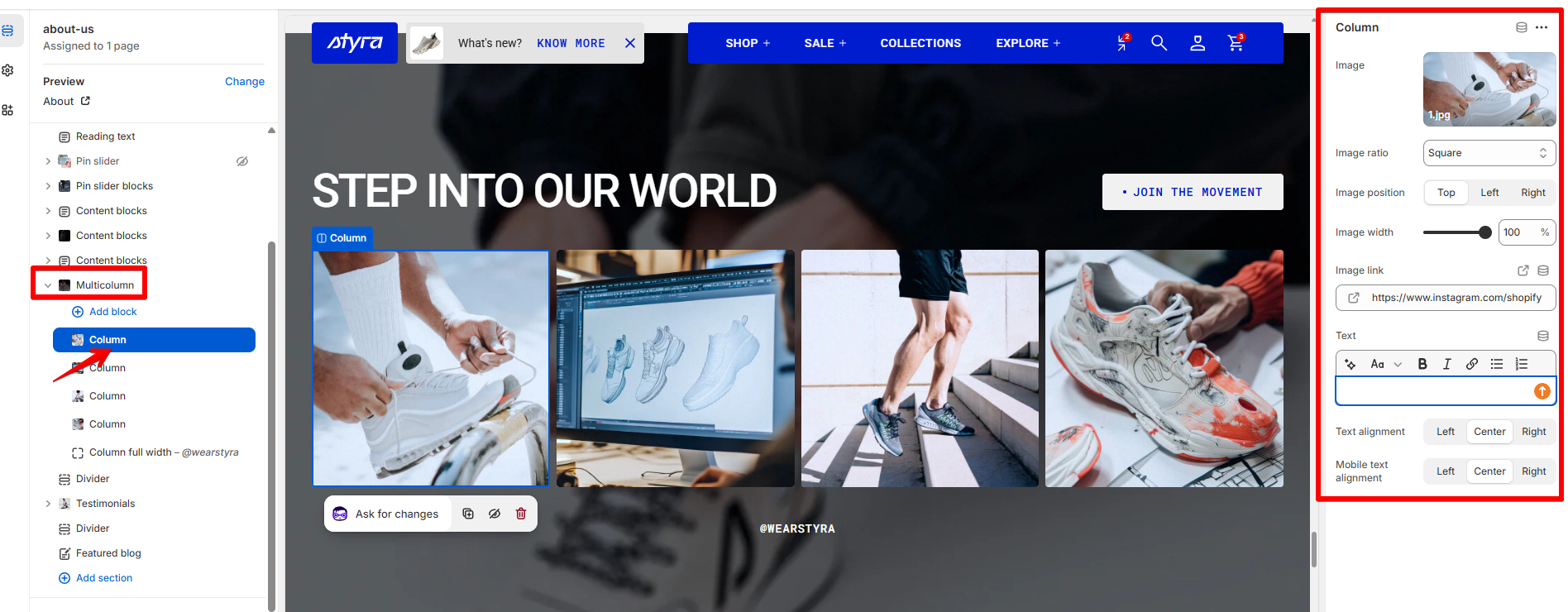 Within the block settings, you can customize image and text presentation, including image ratio, image width, and image position. You can also adjust text alignment, text styles, and font settings.