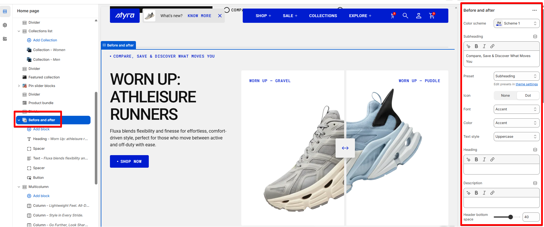 | Before image | Upload an image that will be showcased on the left side of the block (the “Before” image). |