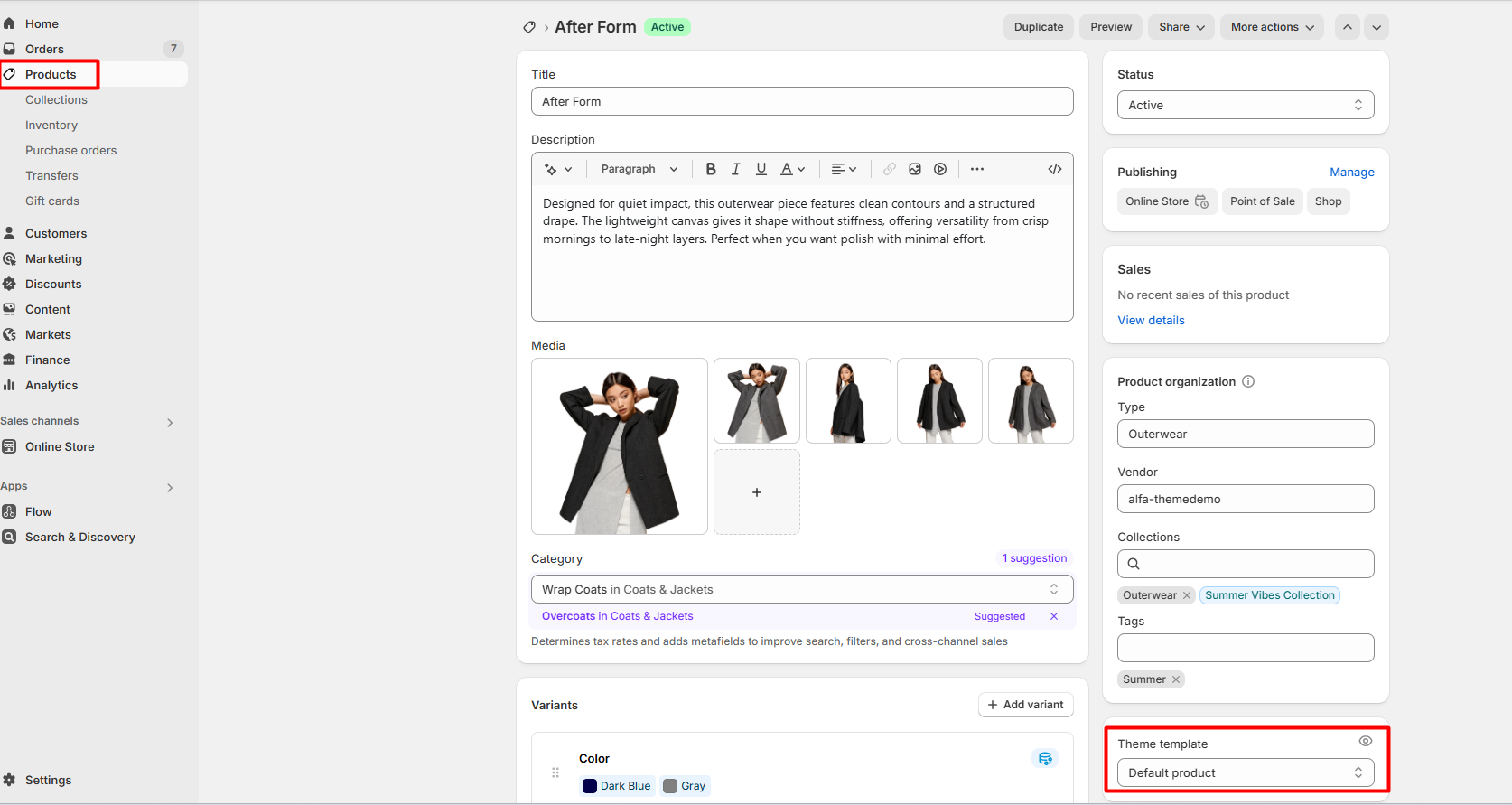 - In the Theme template section, click the drop-down menu and then select the template that you want to apply to your product.