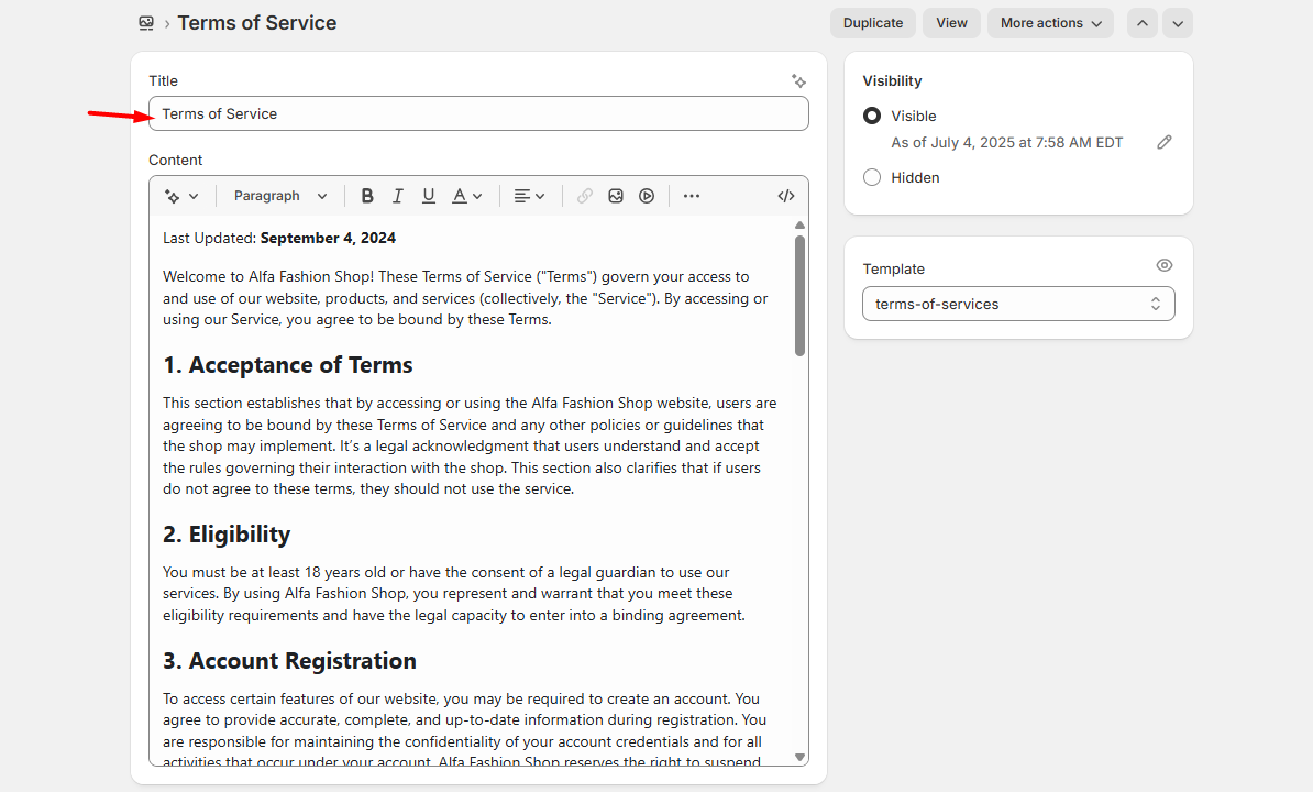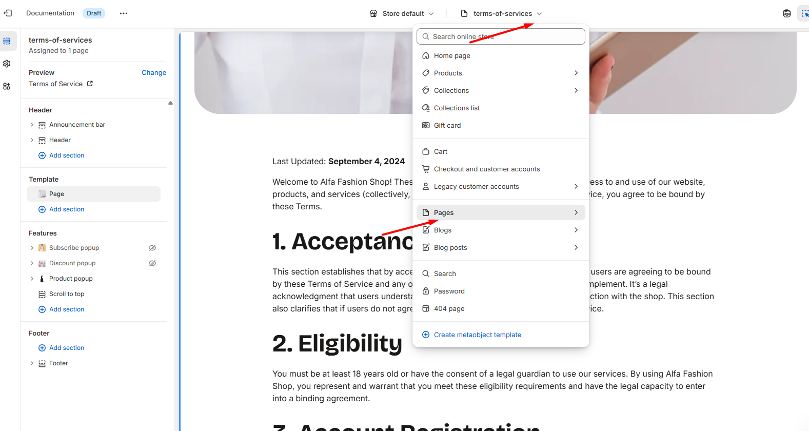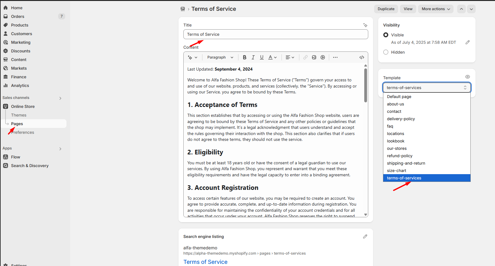 - Navigate to Online Store > Pages in your admin panel.