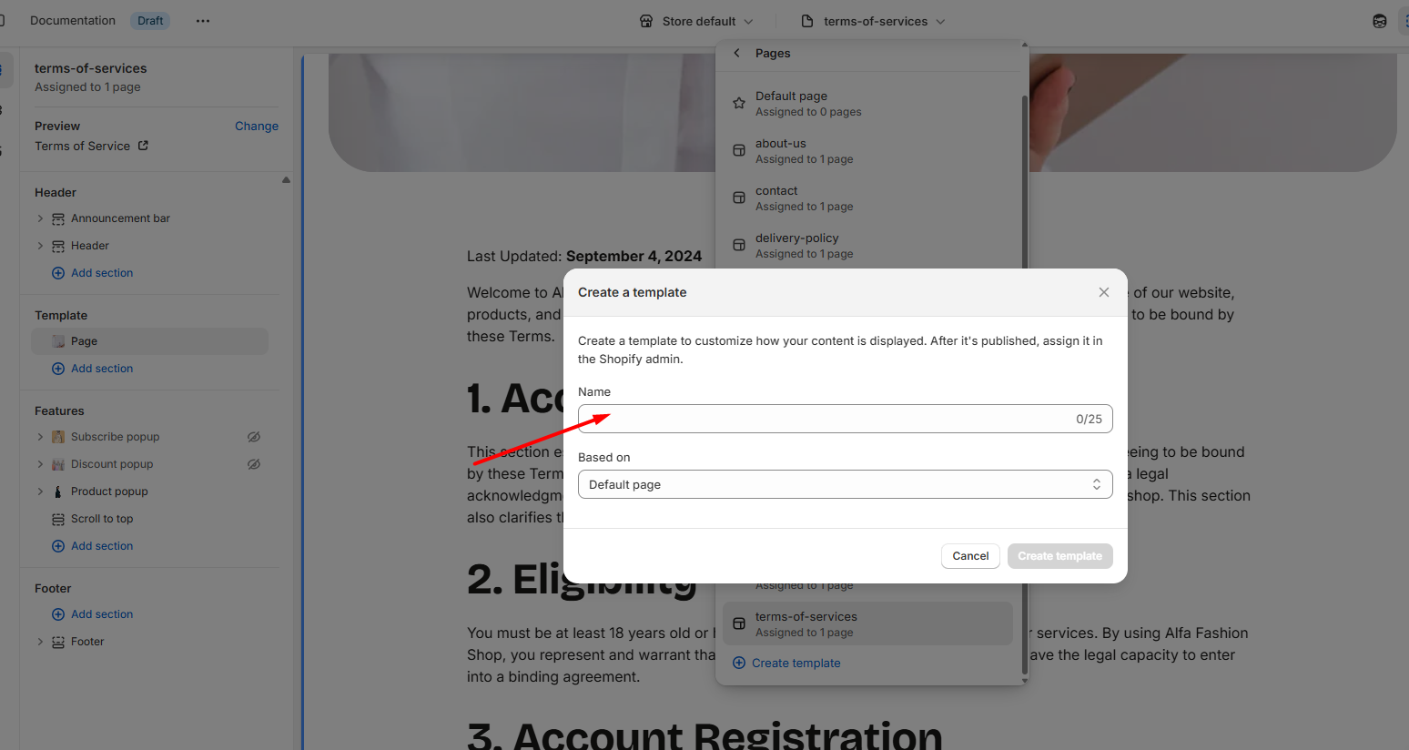 - Enter a name for the new template (e.g., “About Us” or “Custom Page”).