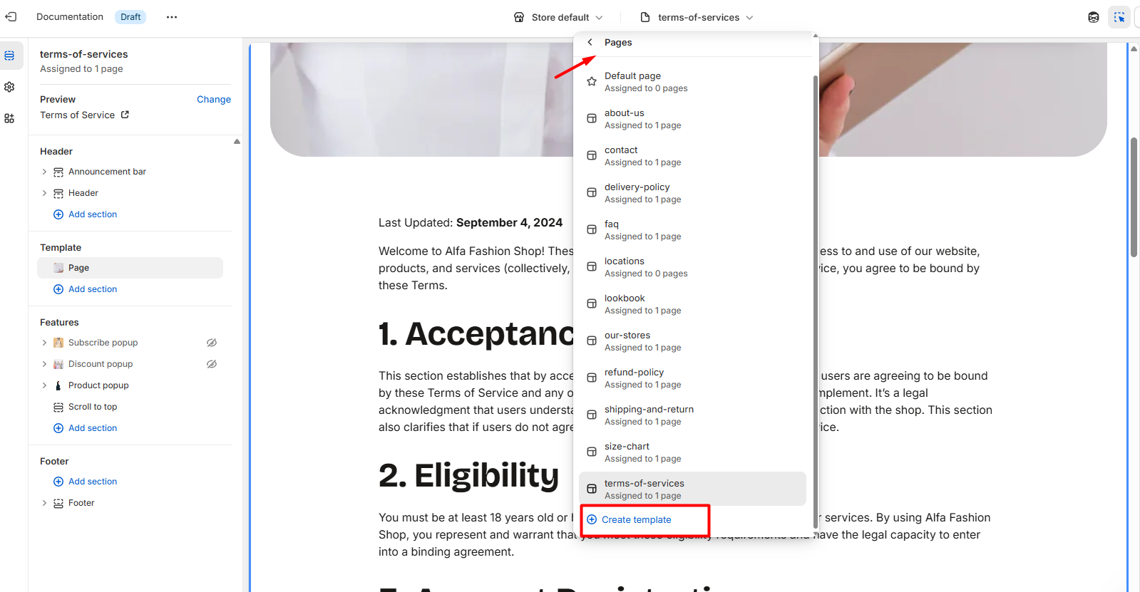 - Navigate to Online Store > Pages and open the page you want to connect.
