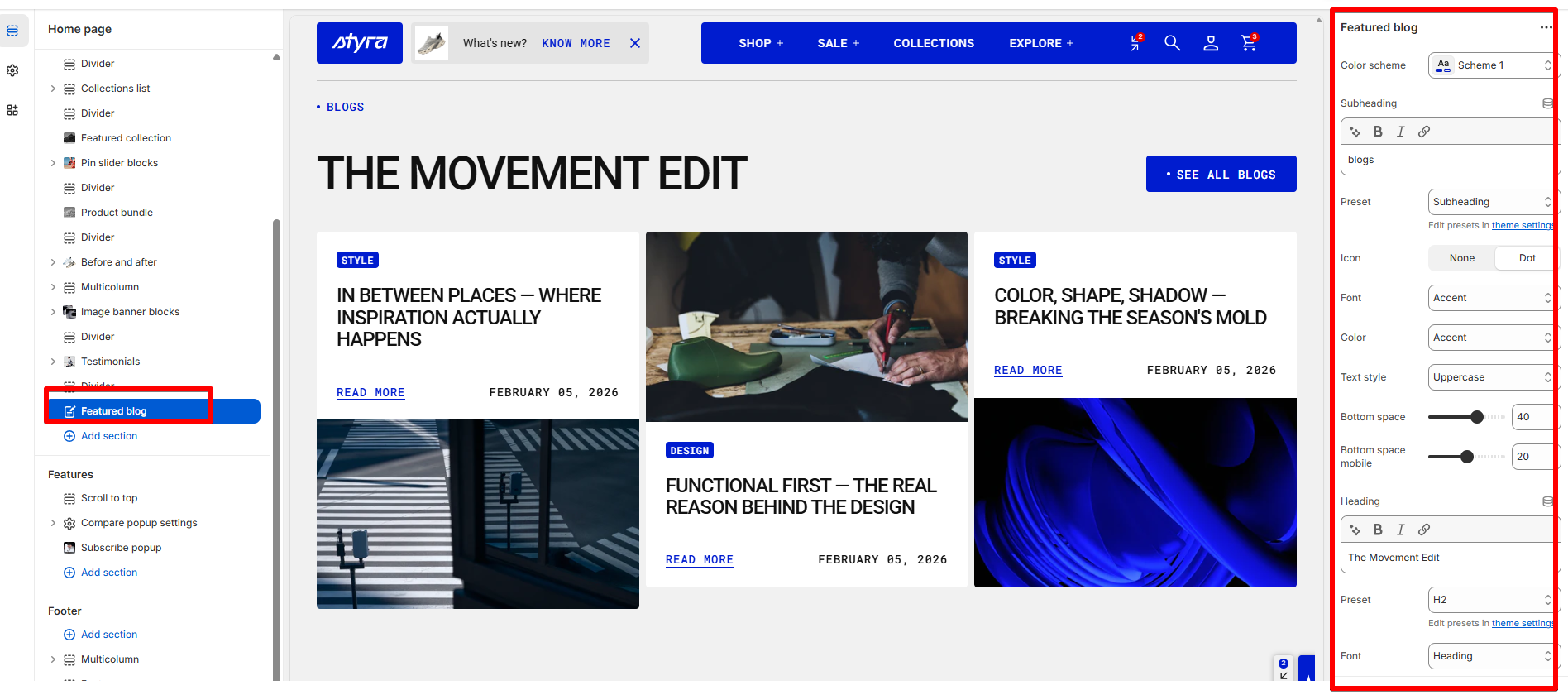 The Featured blog section allows you to feature selected blog articles on your store’s pages. It helps you engage your audience with relevant content, improve SEO, and drive traffic to your blog.