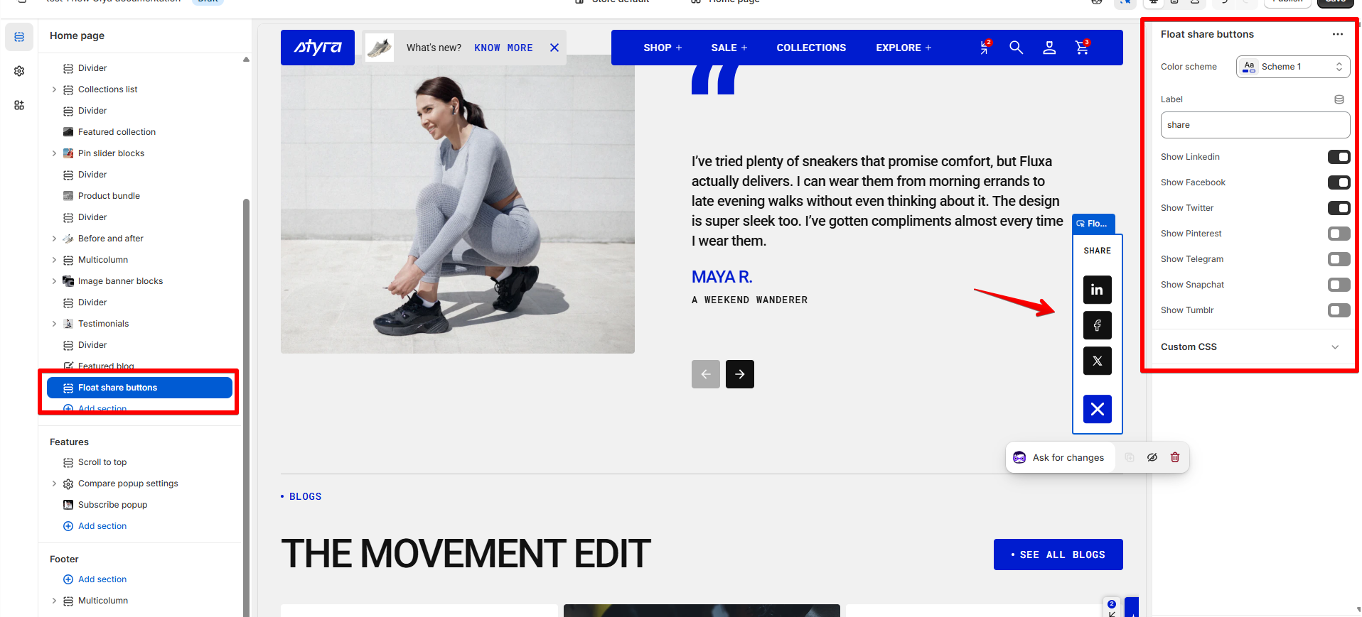 To start customizing your section, click on the “Float share buttons” section to access its settings.