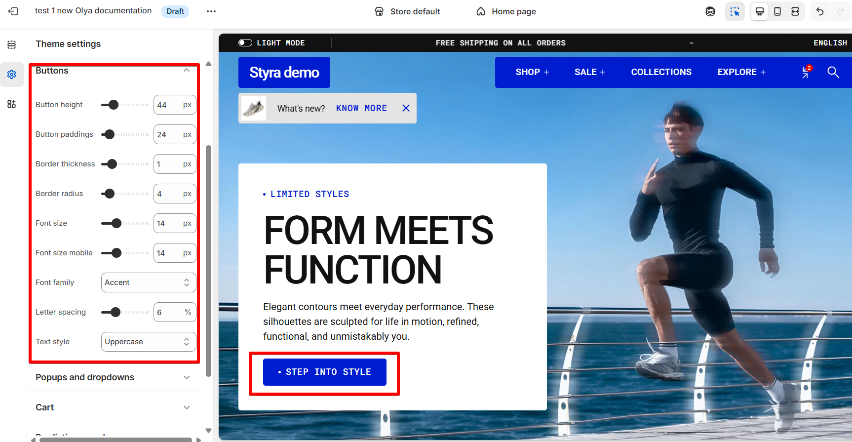 | Letter spacing | This setting controls the spacing between characters in buttons, allowing you to make the text more compact or more spaced out for improved readability and style. |