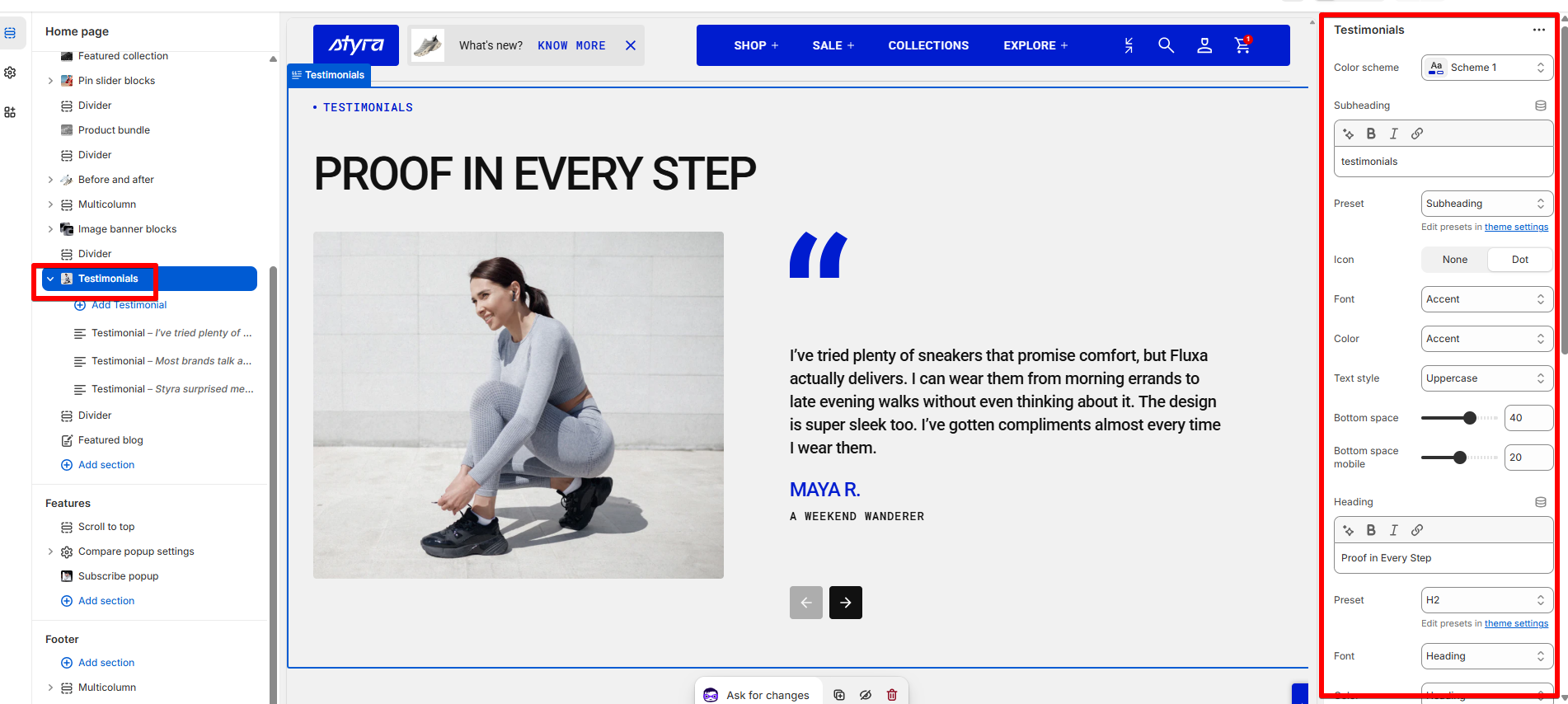 The main feature is that you can place an image or video on the left and a testimonial review on the right. You can choose to display the default quote icon or add a custom quote. Testimonials can be navigated using arrows or by scrolling with a mouse.