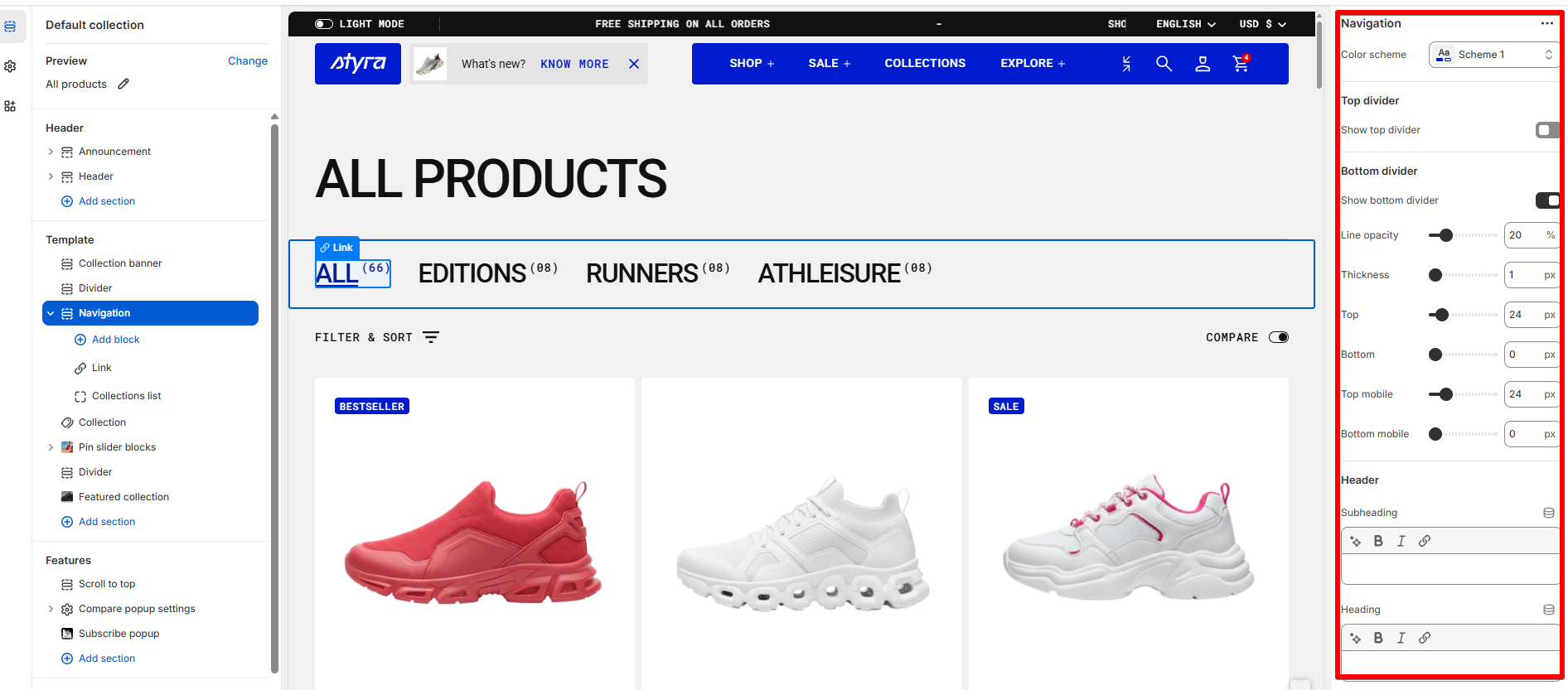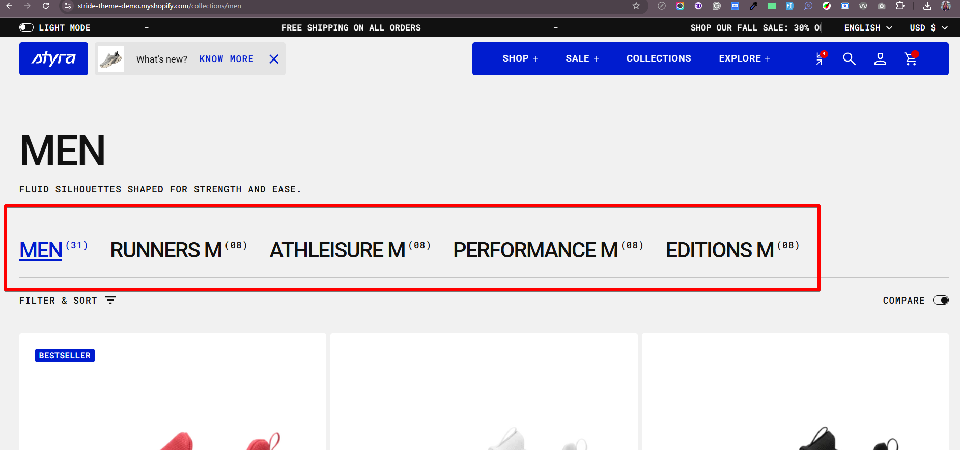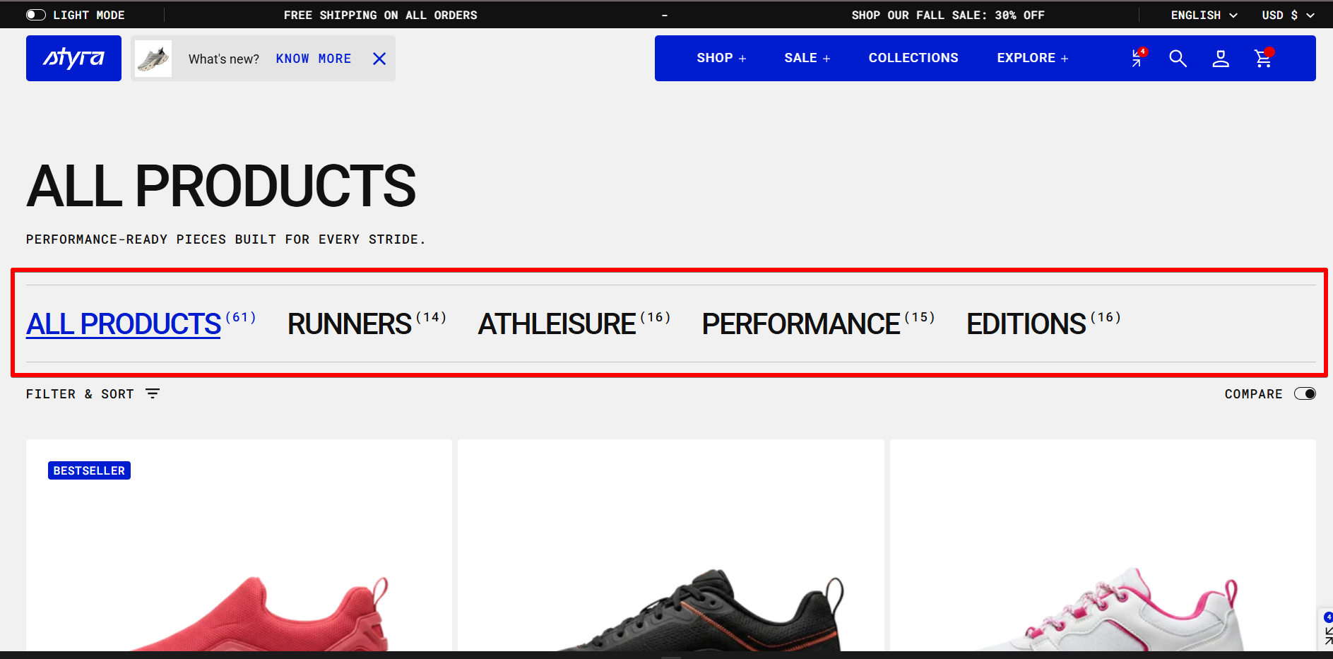 Here we can see All Products as the main collection, with created collections - categories Runners, Athleisure, Performance, and Editions, which contain both Women’s and Men’s sneakers together.