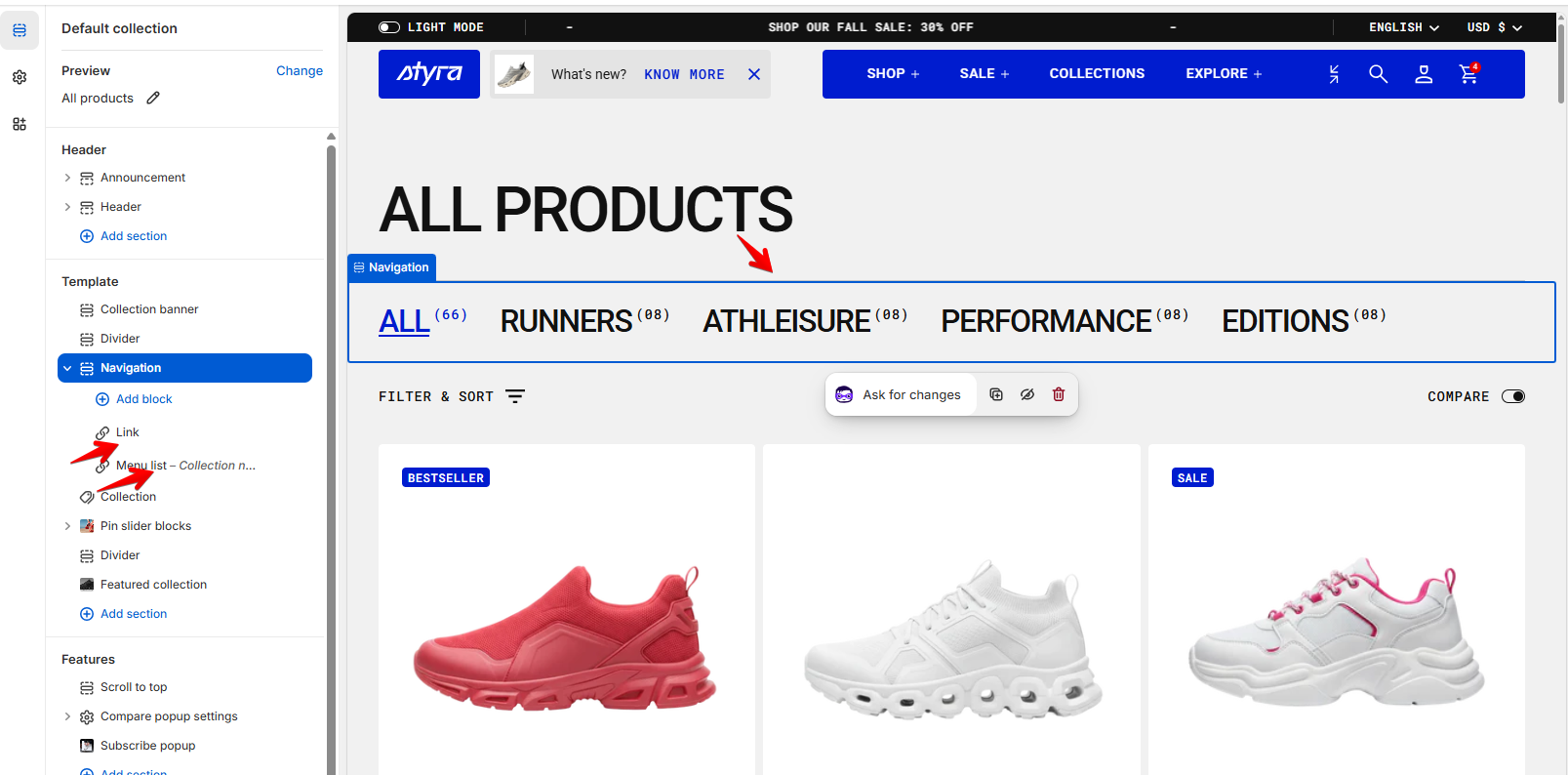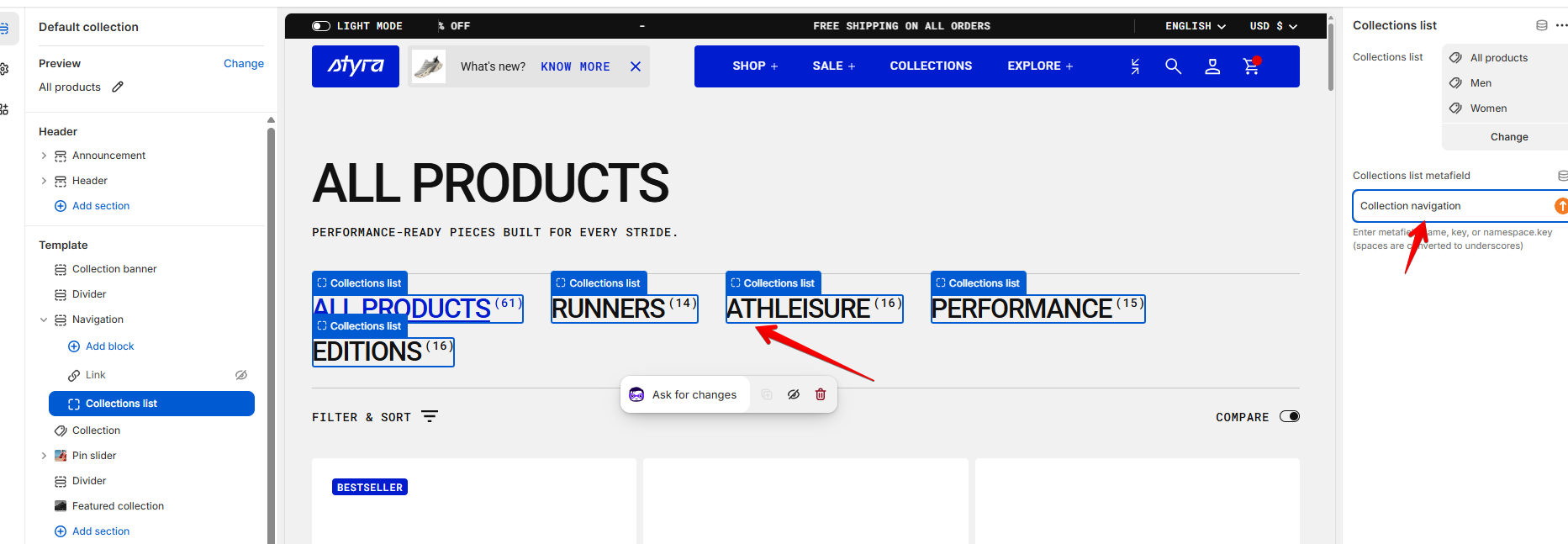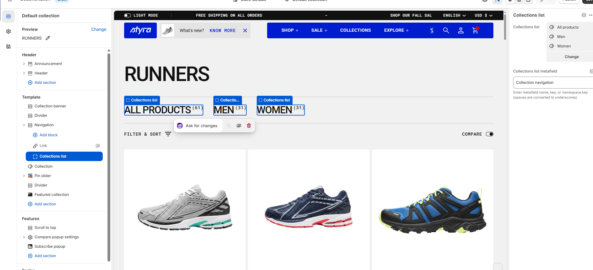 Here we can see All Products as the main collection, with created collections - categories Runners, Athleisure, Performance, and Editions, which contain both Women’s and Men’s sneakers together.