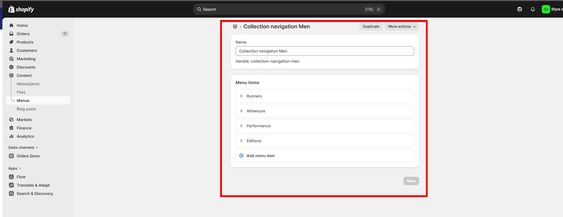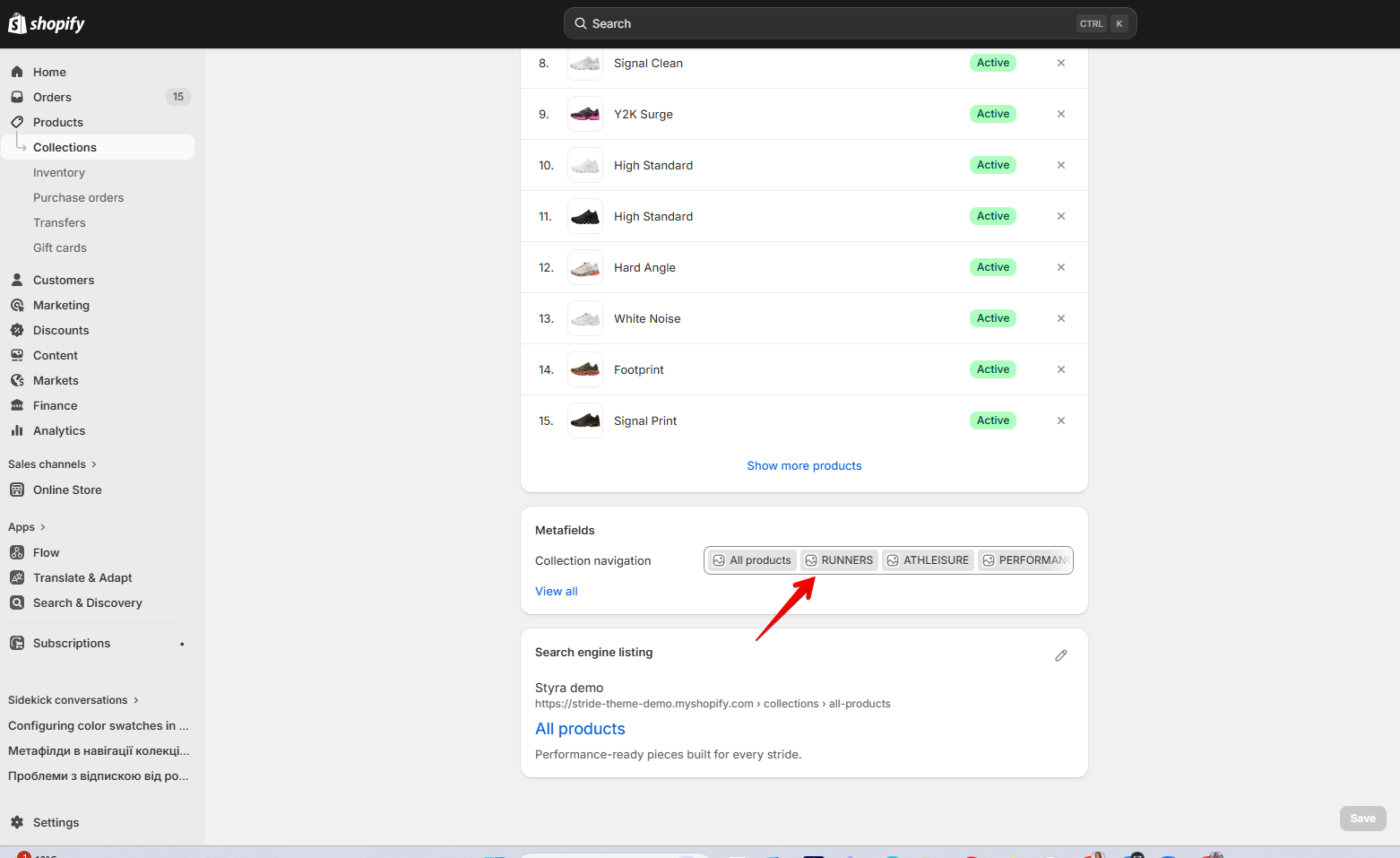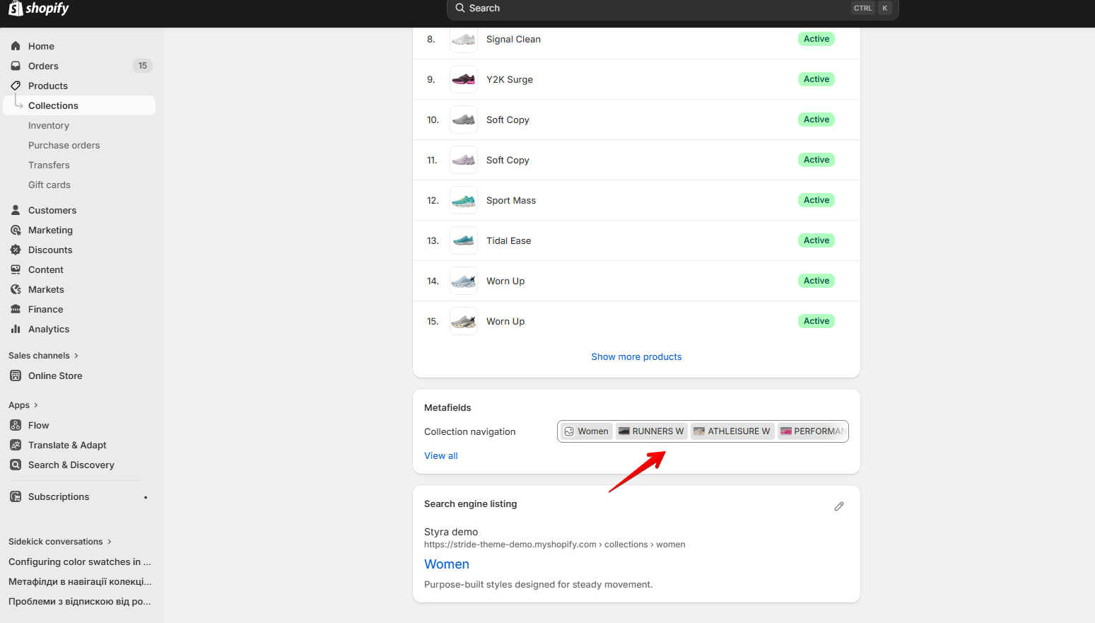 Then we created the collections Runners W, Athleisure W, Performance W, and Editions W (Women sneakers), as well as Runners M, Athleisure M, Performance M, and Editions M (Men sneakers), and added the related collections to Women and Men collections in the Collection Navigation field created through the metafield.