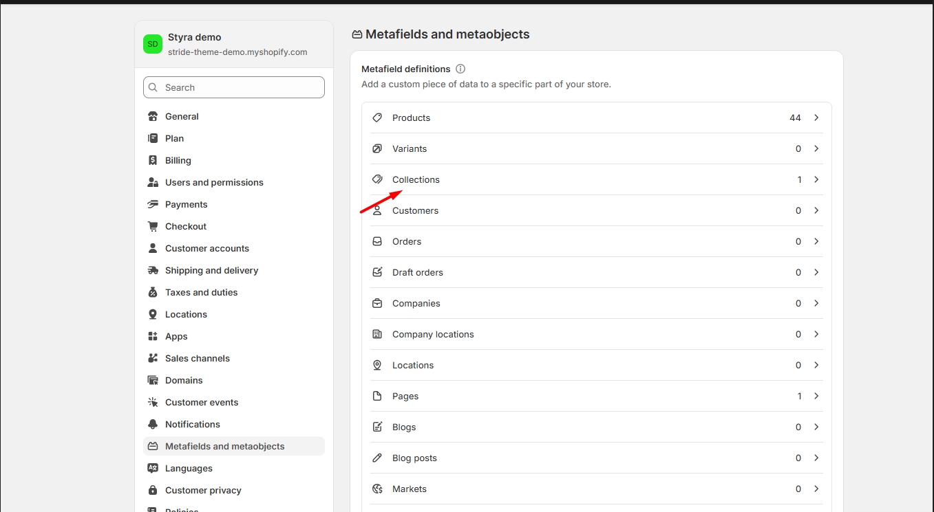 After this, navigate to the Collections section on the dashboard and click on the specific collection where the navigation items should be added through the metafield.
