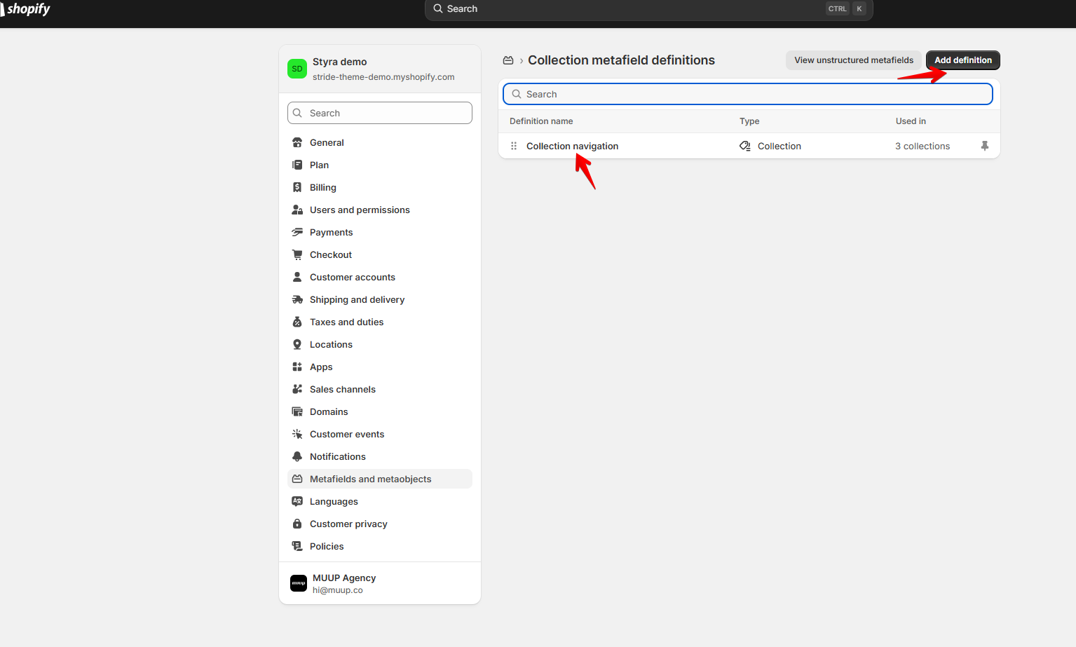 Select the part of your store that you want to add a metafield to - Add metafield in the Collections part.