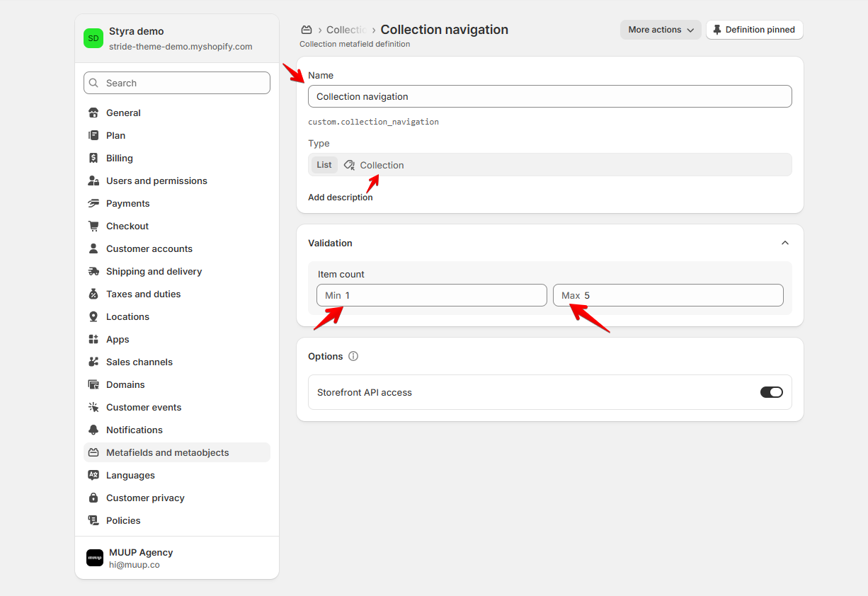 Enter the metafield name, select the type, and specify the item count: the minimum and maximum number of items that can be added to the collection navigation.