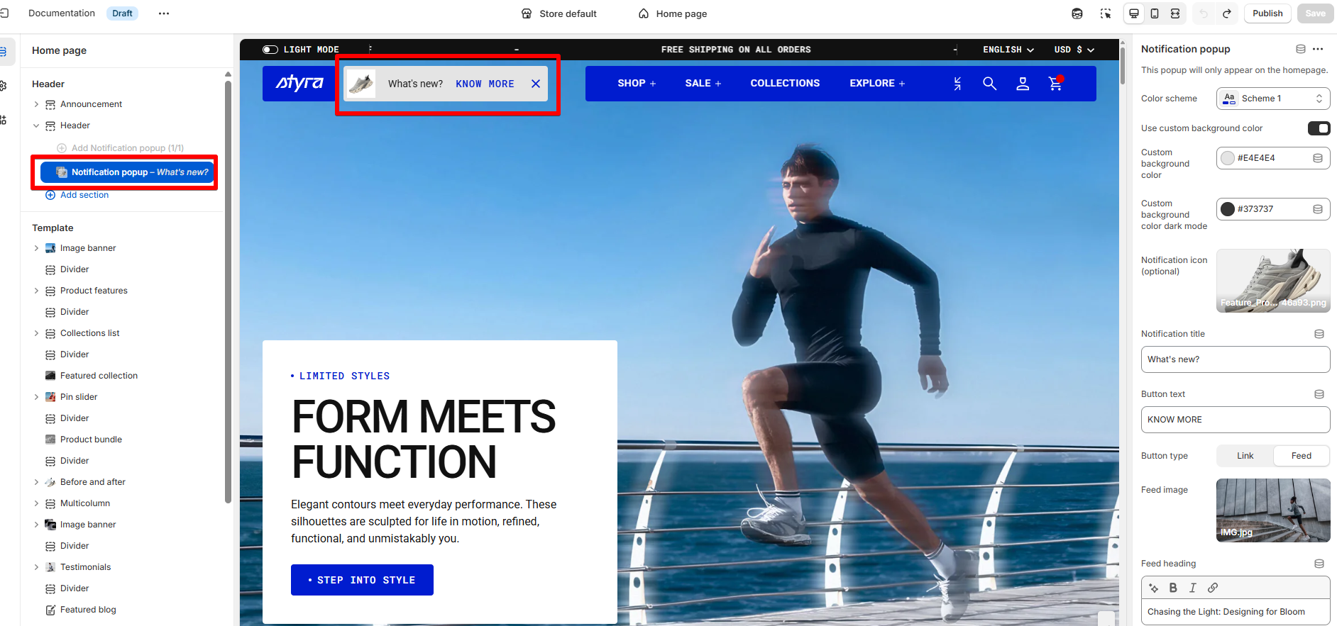 | Custom background color | Select the background color for the notification popup in light mode. |