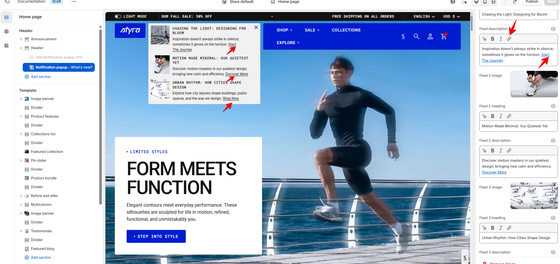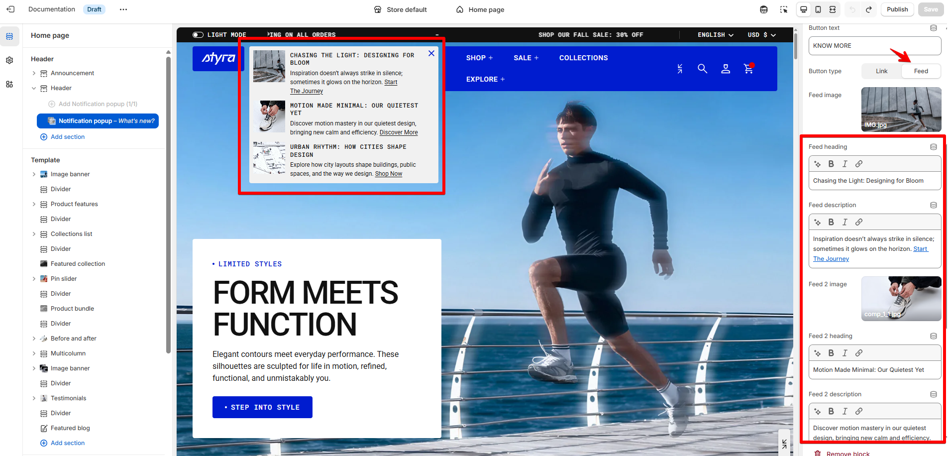 Link: When the button is clicked, it redirects the user to the specified link. Feed: When the button is clicked, a feed will appear with a heading and description that can be added in the Notification popup settings. |