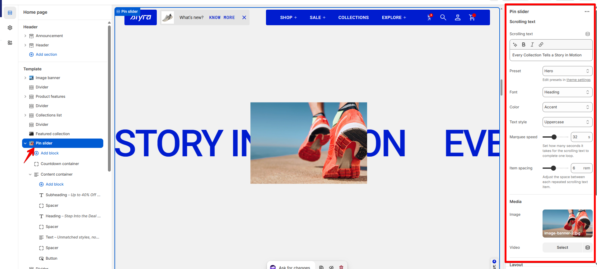 Within the Pin Slider, you can add Content Container and Countdown Container blocks positioned on top of the media. The Countdown Container block is used to display countdown elements, while the Content Container block can include a subheading, heading, text, button, and a product horizontal card.