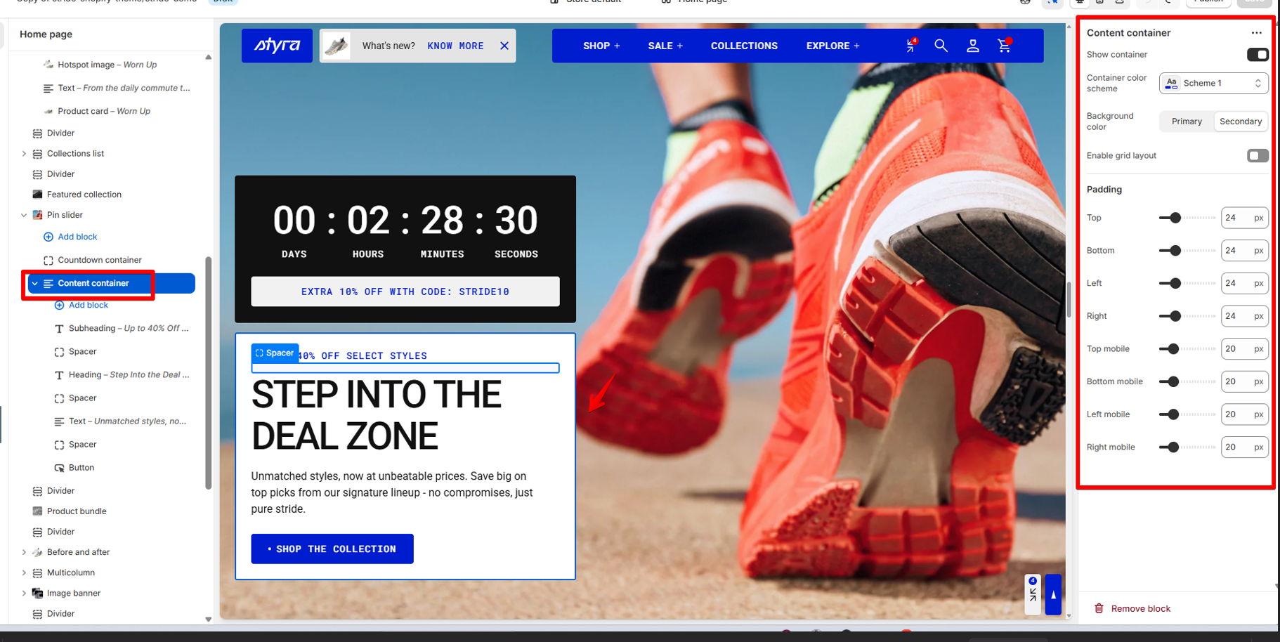 | Enable grid layout | Place your content in a grid layout using the following blocks: subheading, heading, description, button and product card horizontal. |